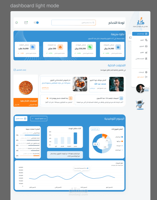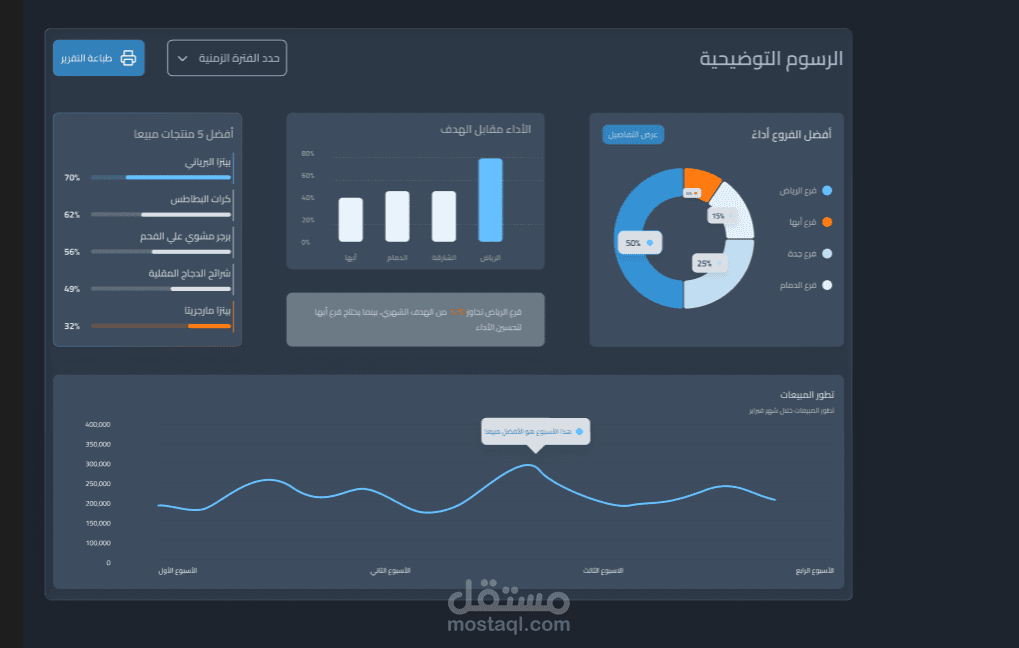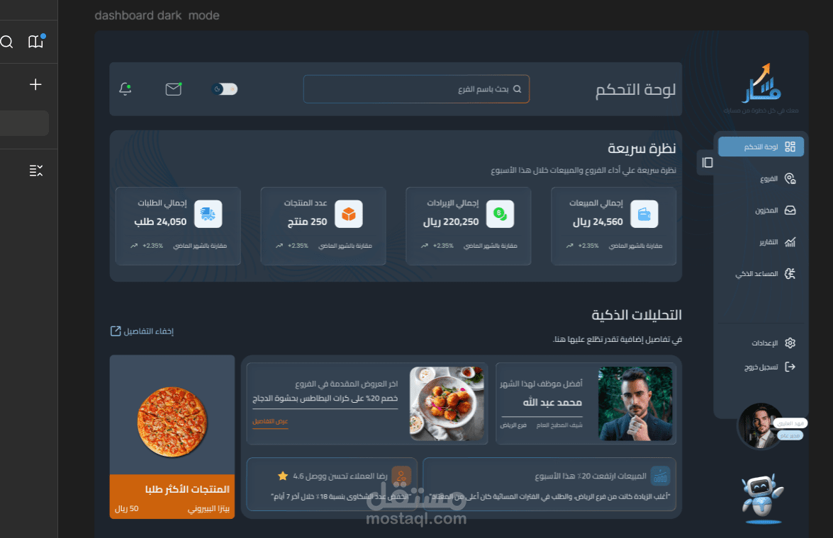 تجمع الداشبورد أهم مؤشرات الأداء في مكان واحد، مثل المبيعات، الطلبات، أداء الفروع، والتقارير اليومية، مع عرض بصري واضح وسهل الفهم.