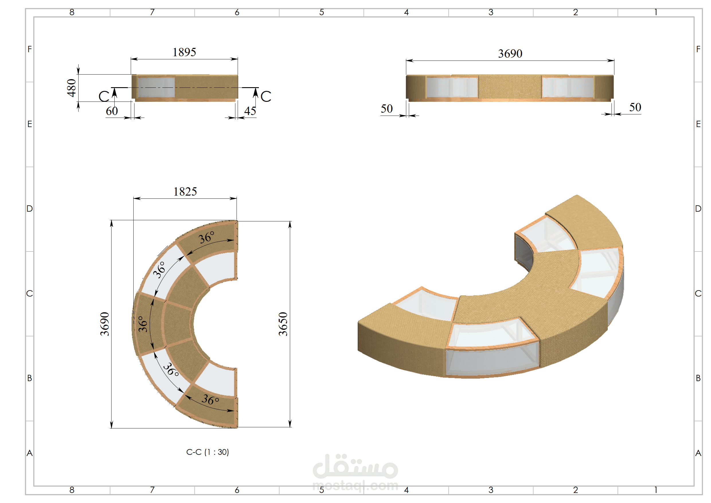 This furniture project showcases an industrial piece designed in SolidWorks. The 3D model was created in SolidWorks, while the 2D layouts were prepared using SolidWorks drawing tools, along with the bill of materials and detailed dimensions.