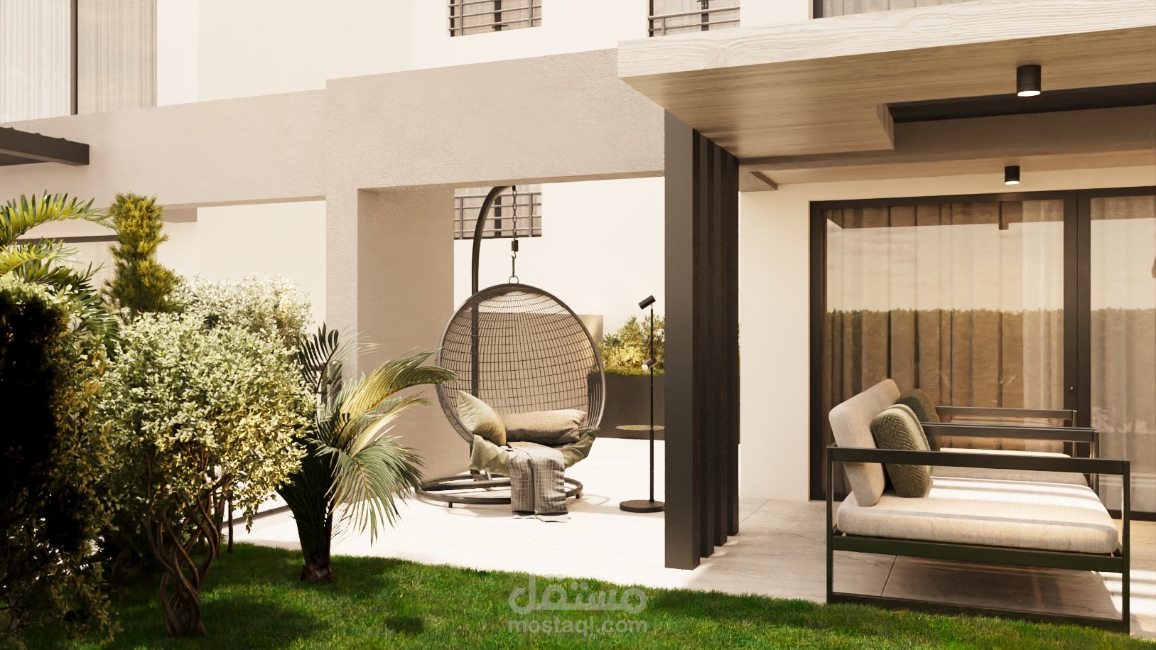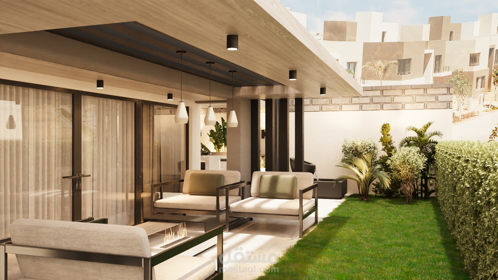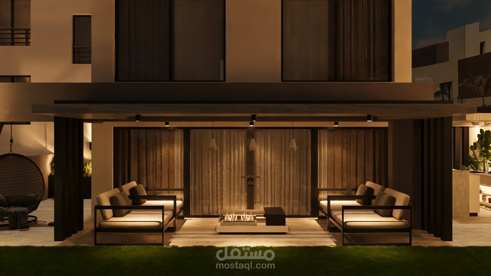 Modern outdoor space designed with a balance between aesthetics and functionality, featuring clean lines, smart zoning, and a seamless integration of landscape elements to create a comfortable and visually appealing environment.