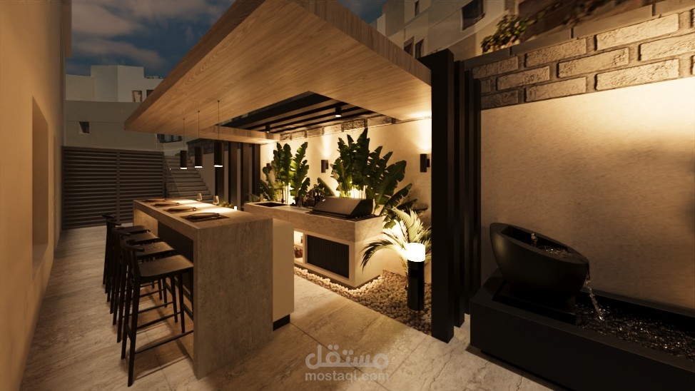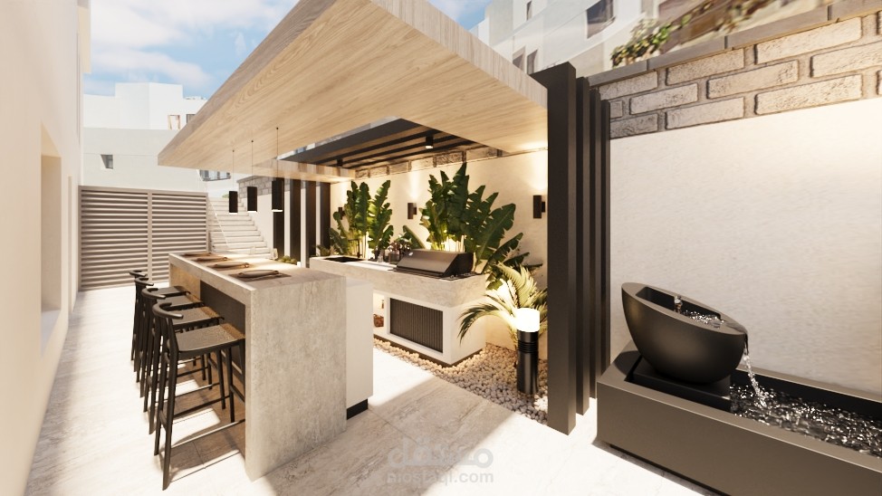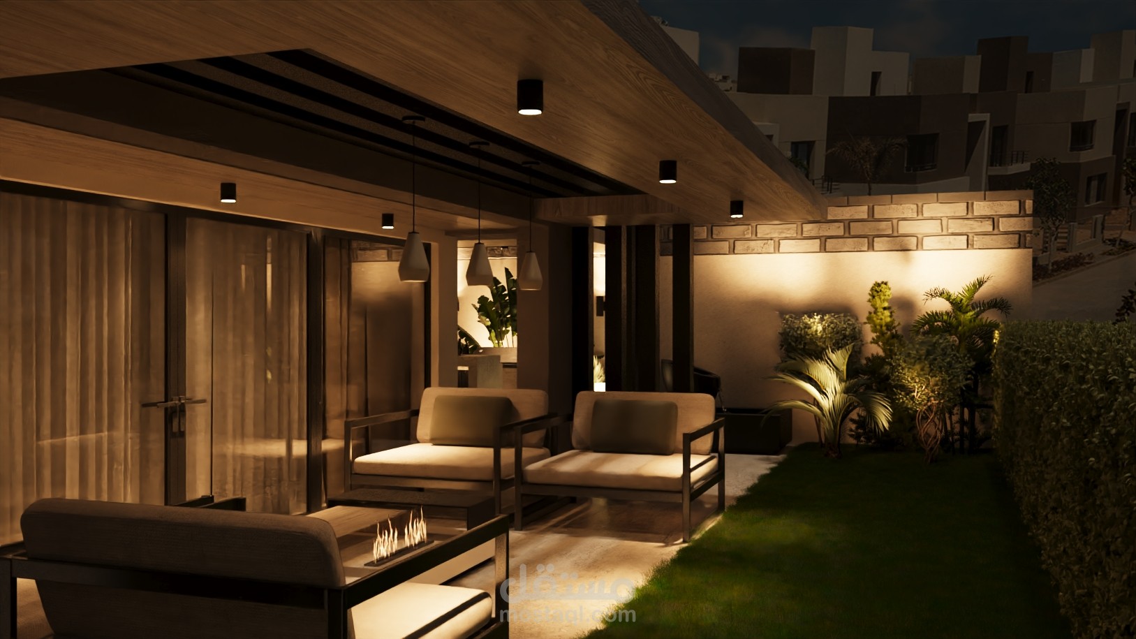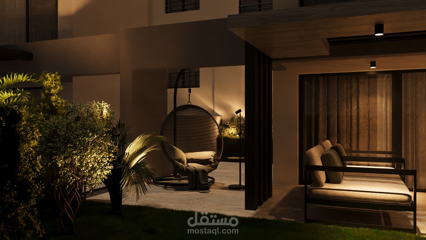 Modern outdoor space designed with a balance between aesthetics and functionality, featuring clean lines, smart zoning, and a seamless integration of landscape elements to create a comfortable and visually appealing environment.