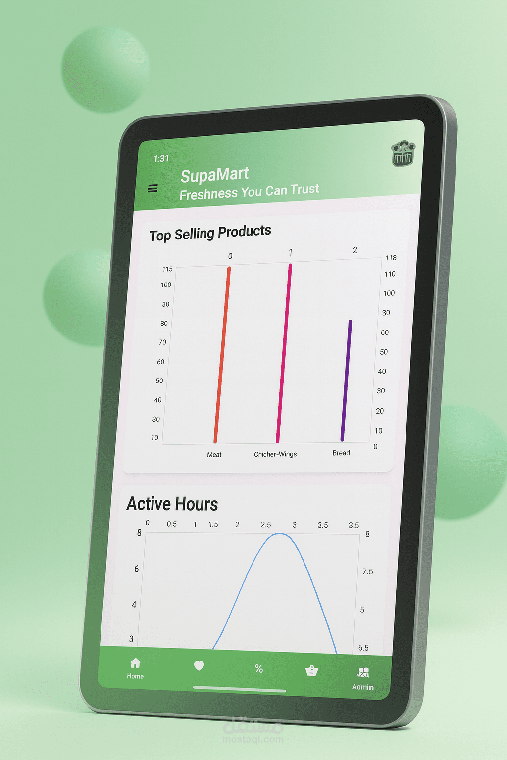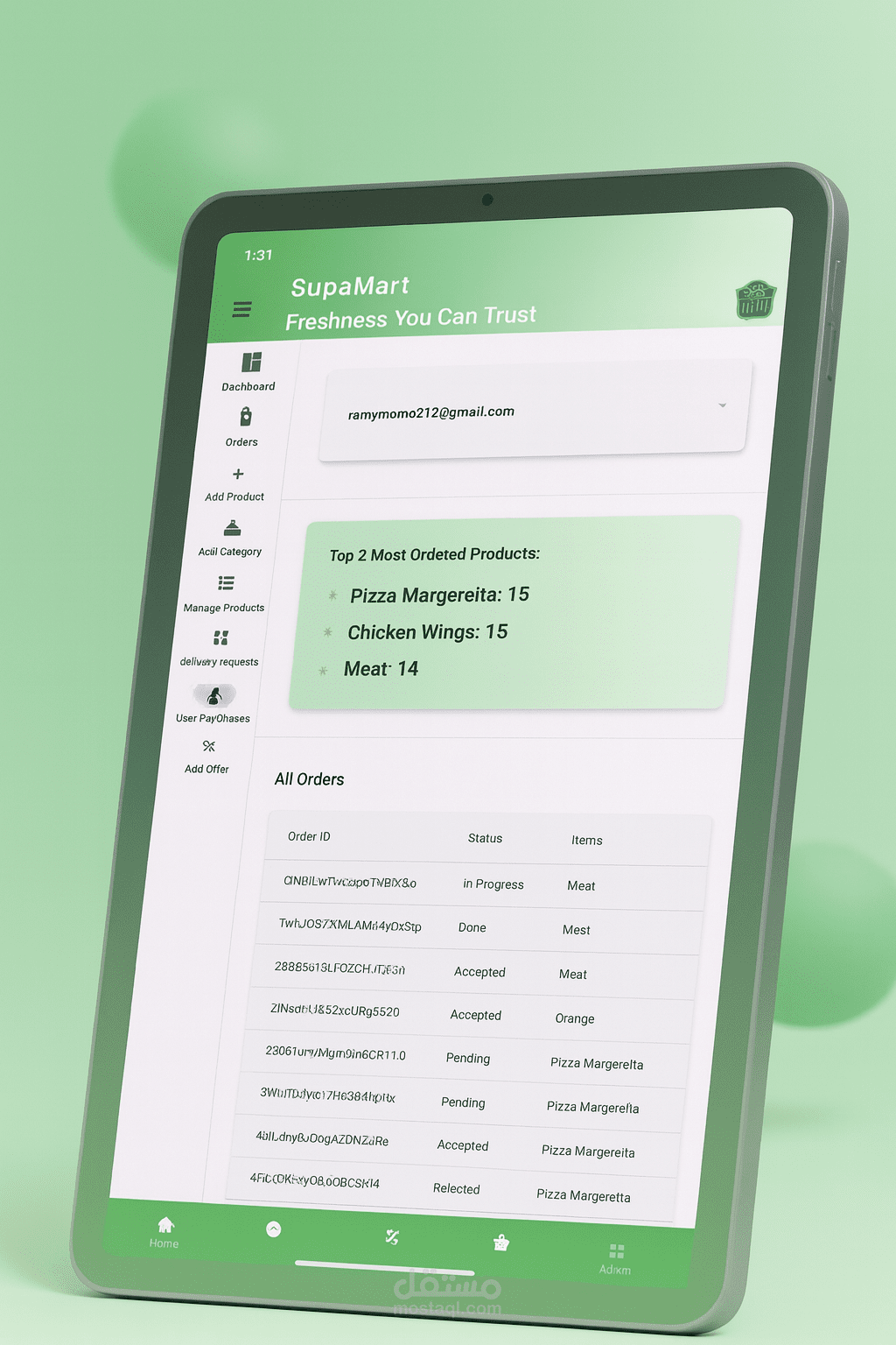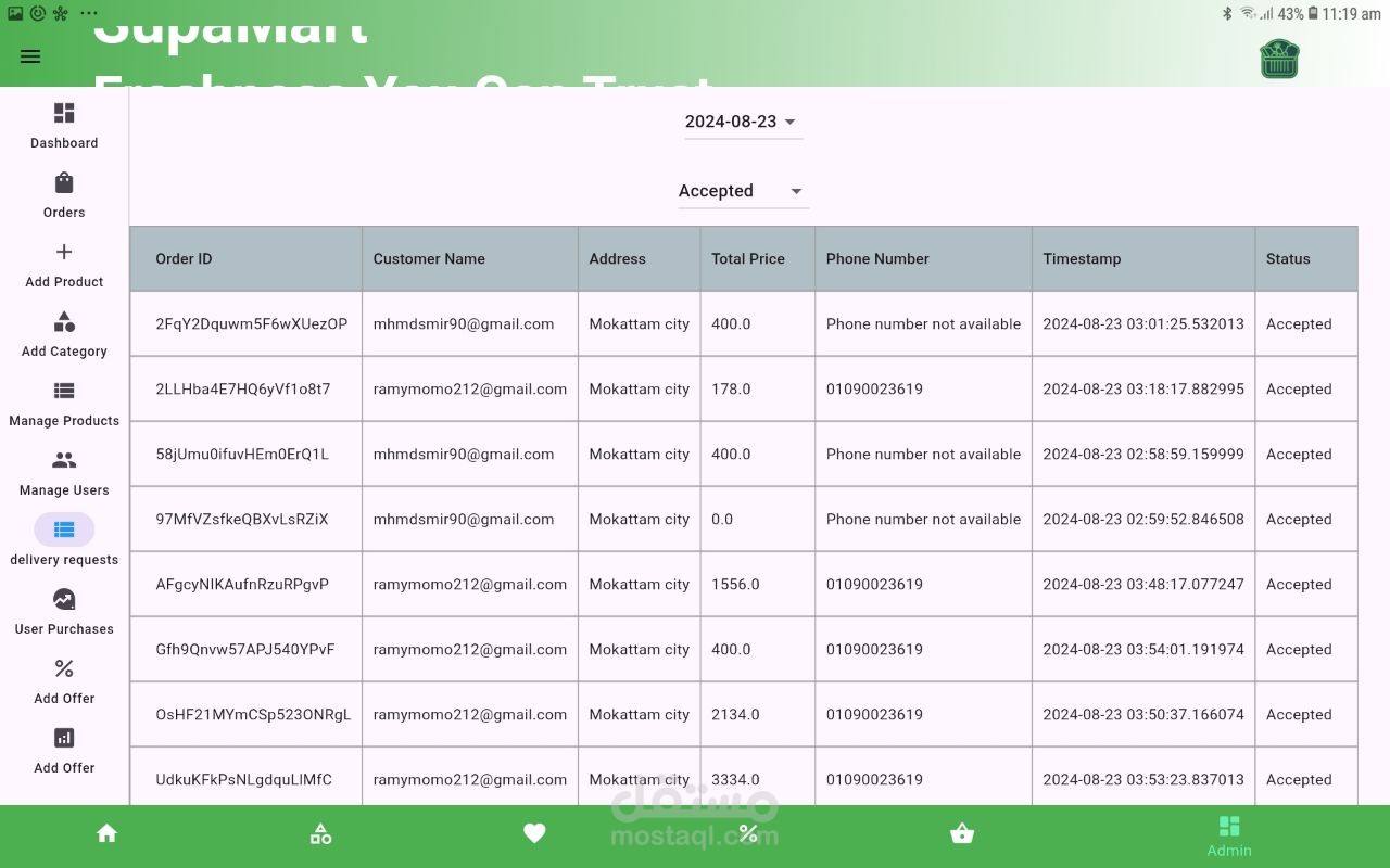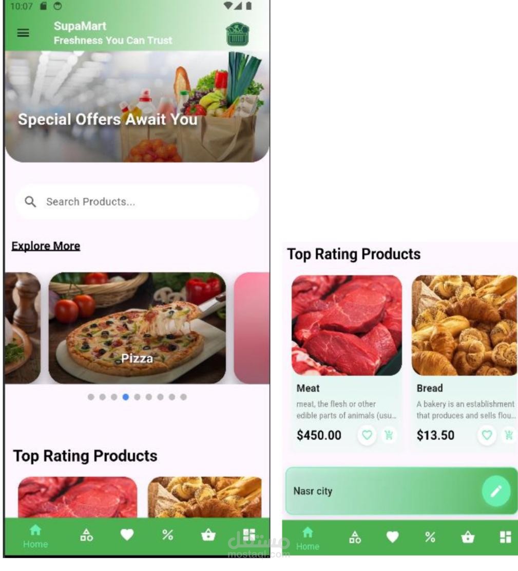 E-commerce Super Market App, With Very Efficiency Dashboard.-Ai Recommendation Products -Ai Analysis for daily orders and give the admin report for offers -Manage All Resources and display tables and filtering data for orders and products and category