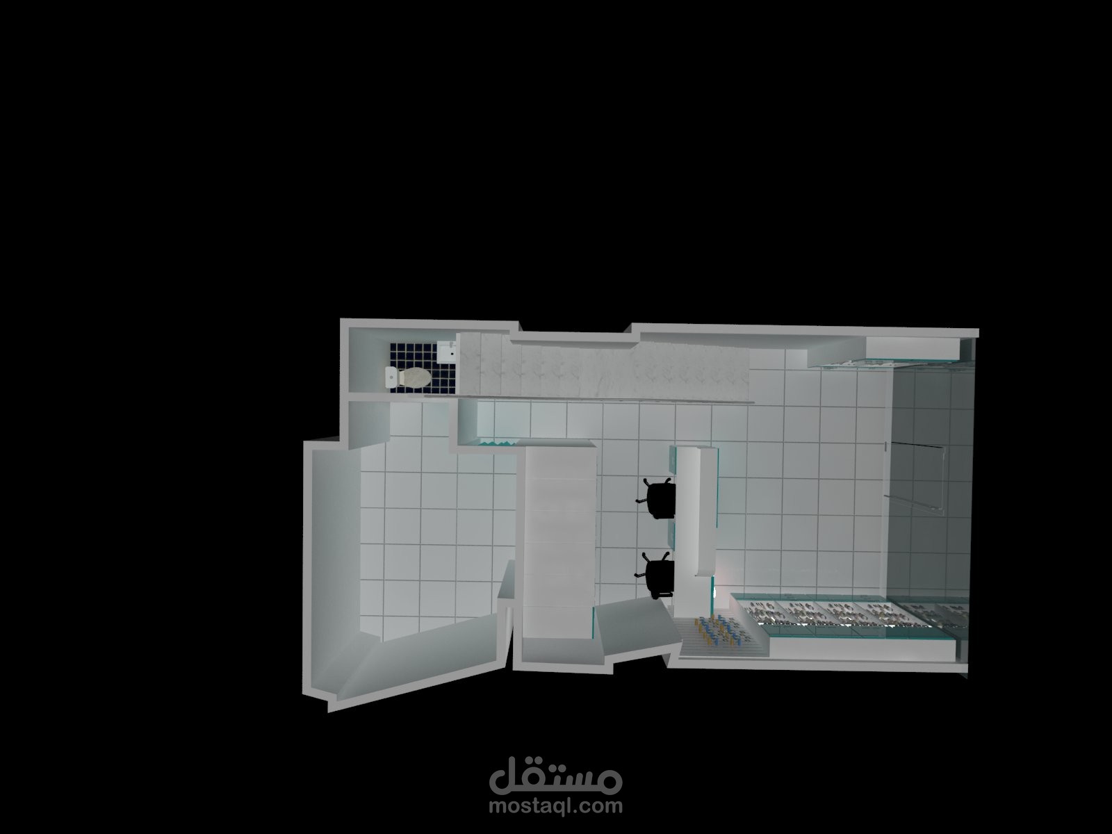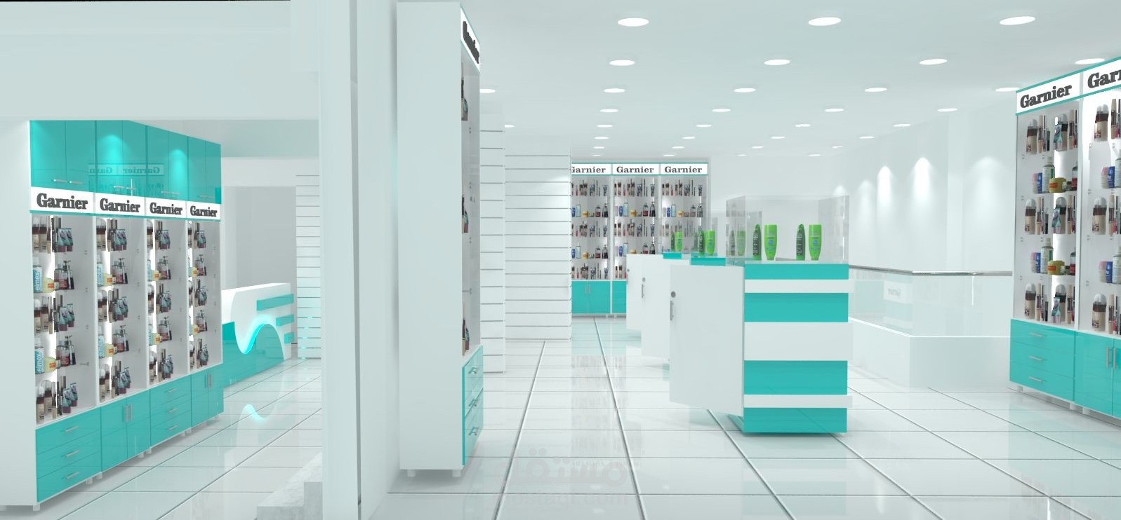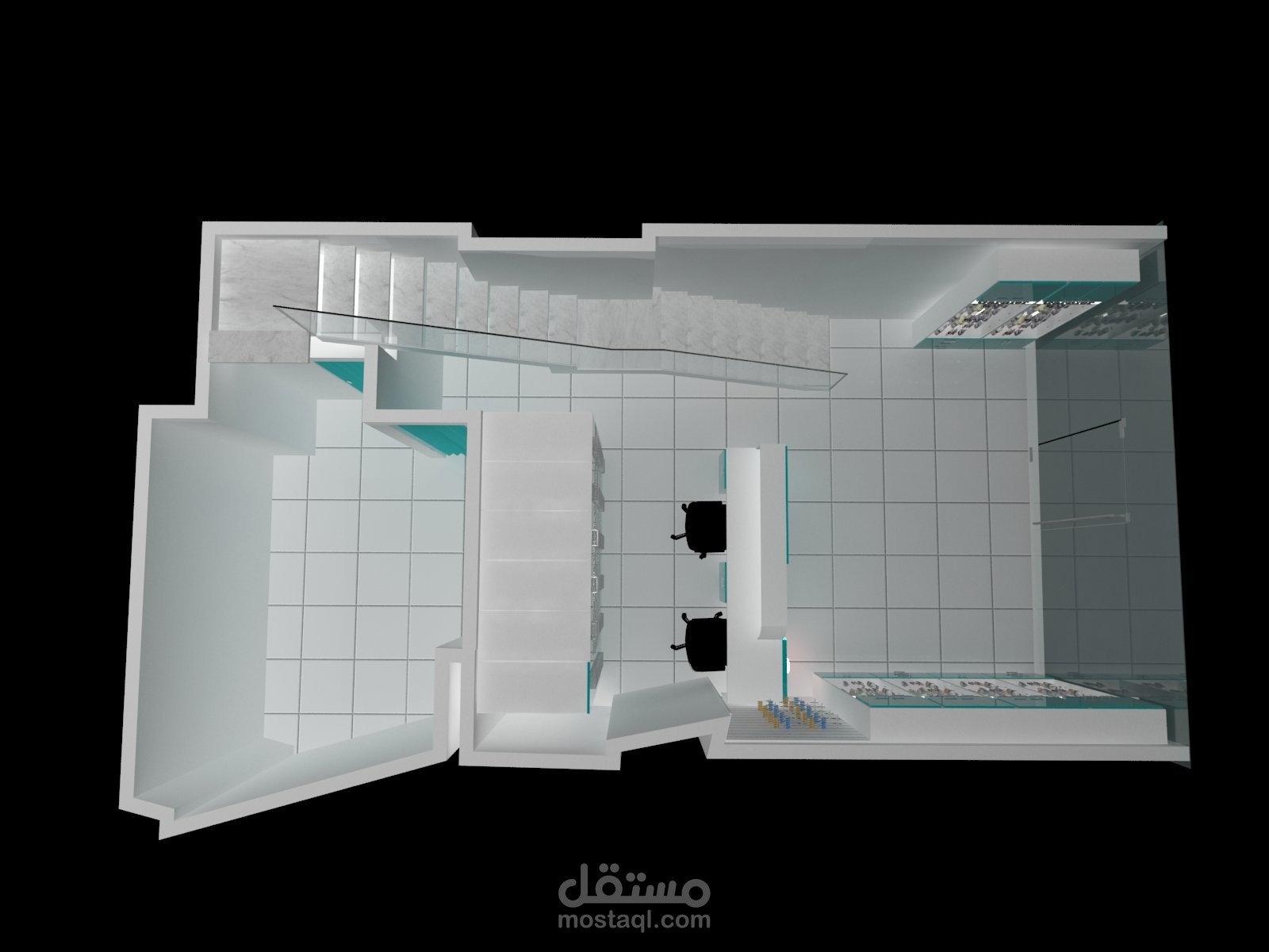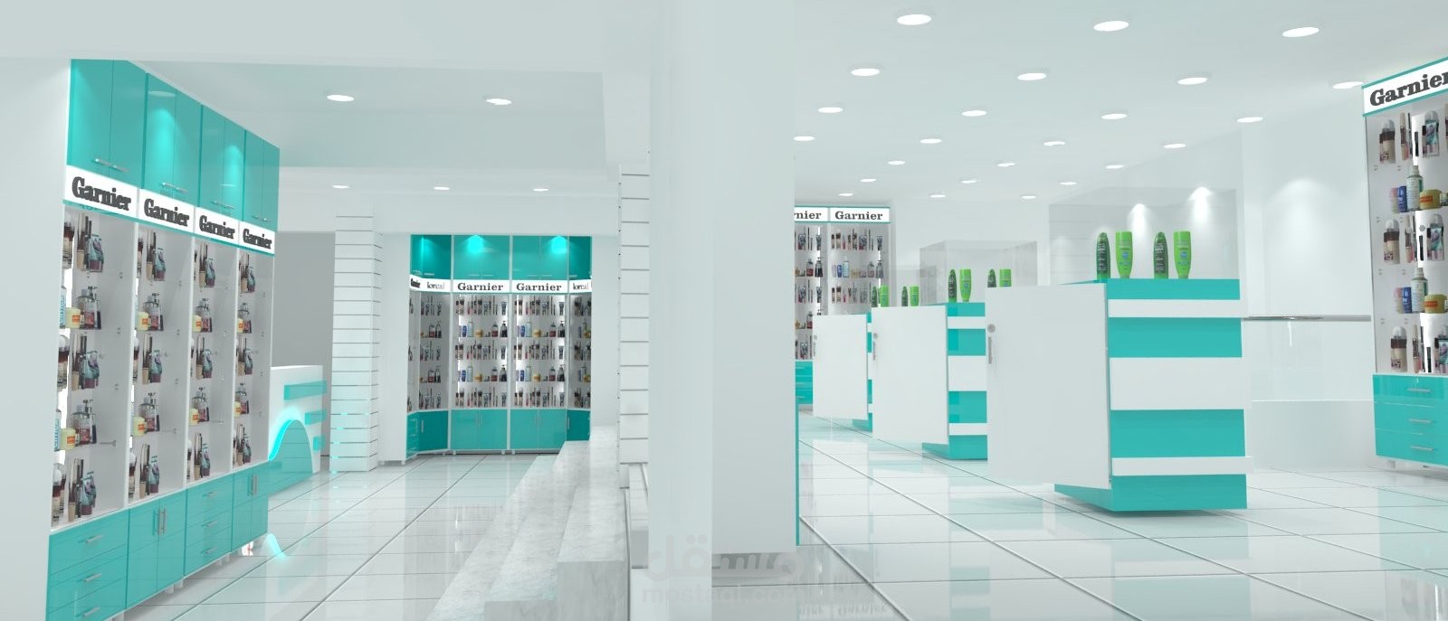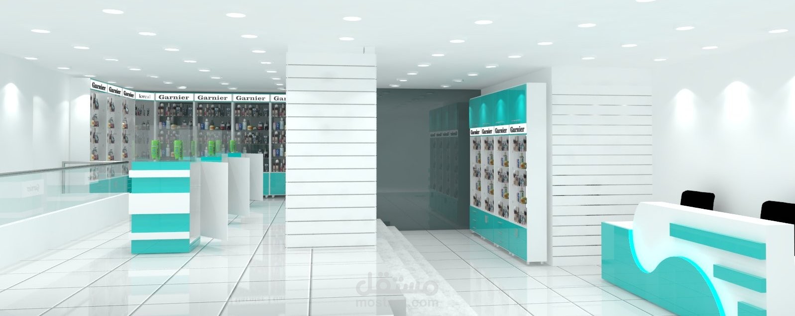 التصميم الداخلي والتقسيم المعماري والاظهار لصيدليه من طابقين.