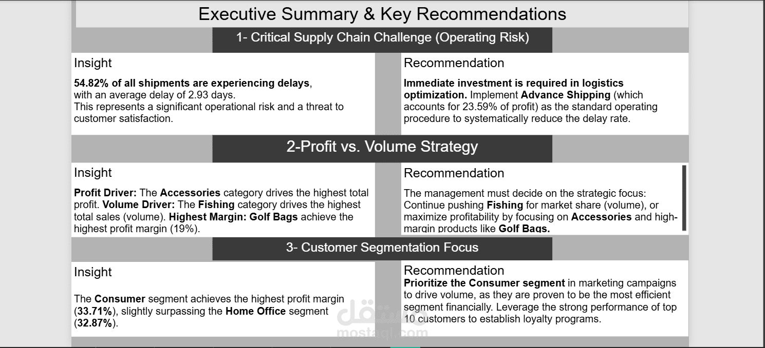 Strategic Recommendations: Provided clear recommendations to management regarding logistics optimization and profitable customer segmentation (33.71% profit margin in the Consumer segment).