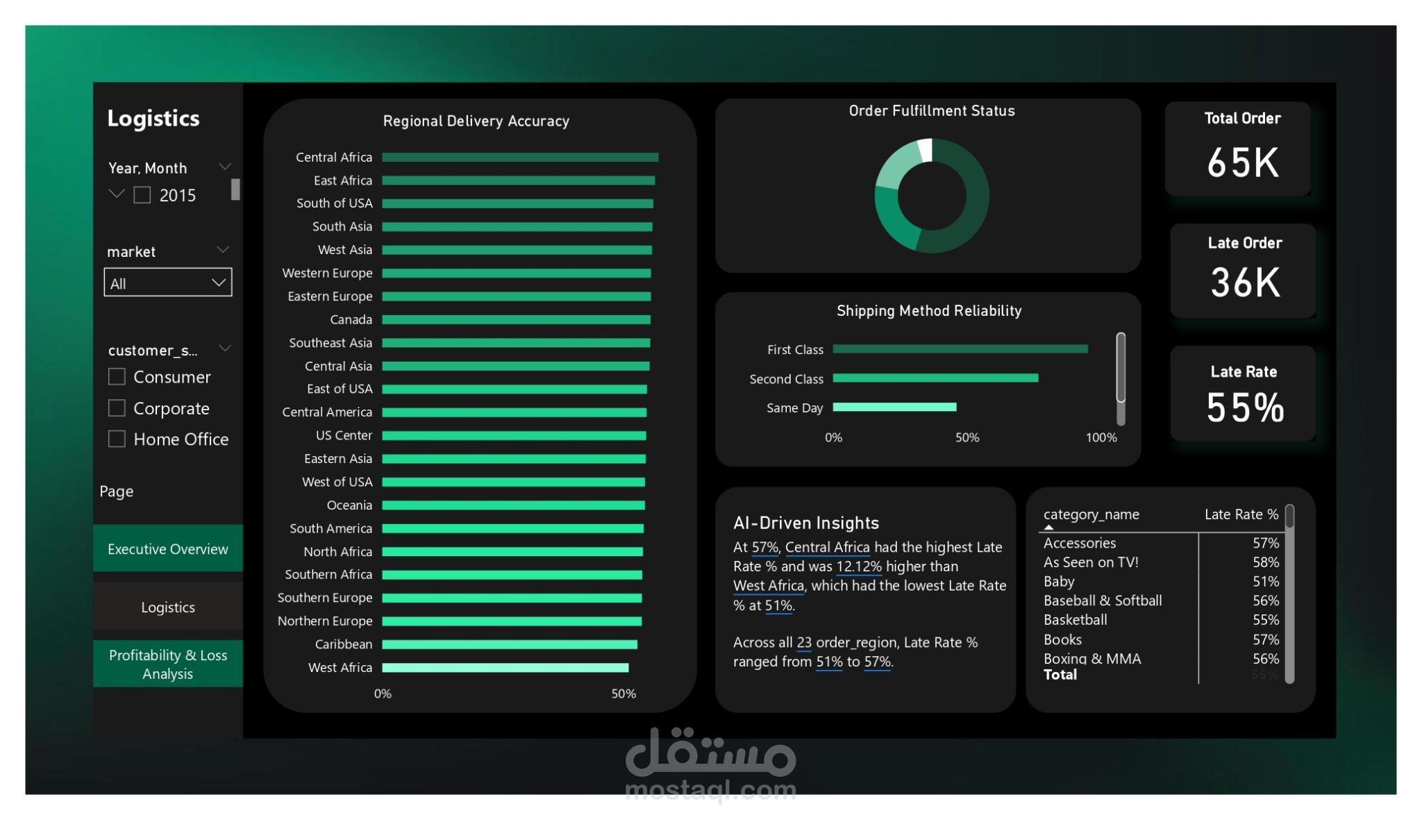 التحليل اللوجستي (Logistics & Delivery): تتبع دقة الشحن (Delivery Accuracy) ومعدلات التأخير (Late Rate 55%) حسب المنطقة الجغرافية لتحديد نقاط الخلل في سلاسل الإمداد.