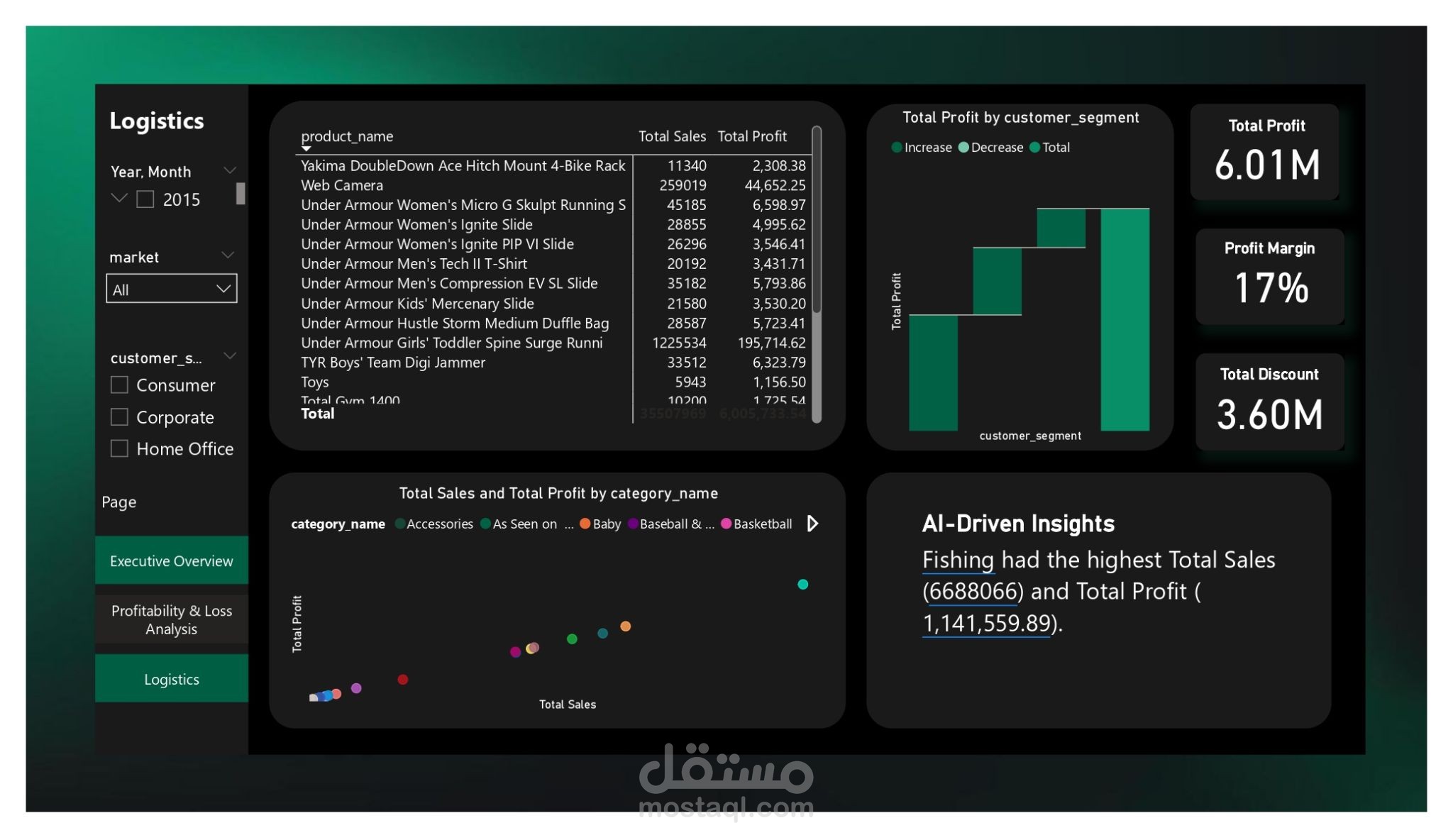تحليل الربحية (Profitability Analysis): صممت واجهة لعرض صافي الربح (6.01M) وهامش الربح (17%) مع تحليل تفصيلي للفئات الأكثر ربحية.