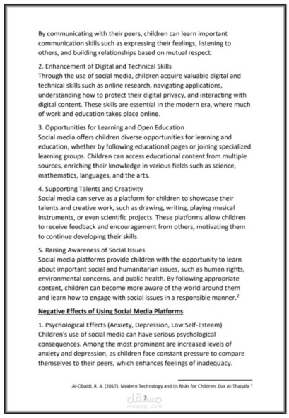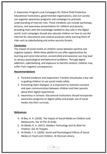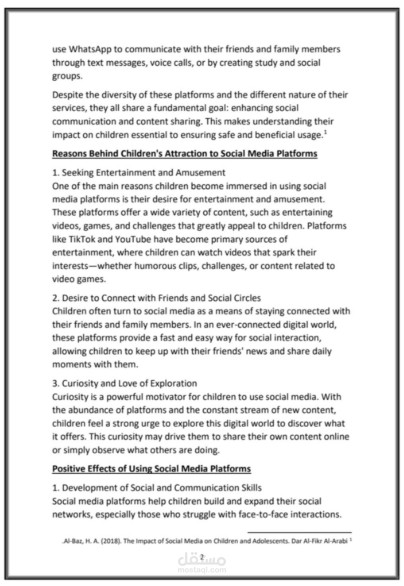 تم ترجمة مقال أكاديمي باللغة الإنجليزية حول تأثير وسائل التواصل الاجتماعي على الأطفال، متناولًا الجوانب الإيجابية والسلبية، وأسباب انجذاب الأطفال لهذه المنصات، ودور الأسرة والمدارس في التوعية والحماية الرقمية. تم تنفيذ العمل خلال نصف ساعة، مع الحفاظ على الدقة اللغوية، الصياغة الأكاديمية، وتسلسل منطقي للأفكار، مع الالتزام بالمصطلحات العلمية والمهنية. عبّر العميل عن رضاه التام عن سرعة التنفيذ ودقة الترجمة، ووضوح المعنى، مما جعل العمل جاهزًا للاستخدام الأكاديمي والبحثي دون الحاجة لمراجعات إضافية.