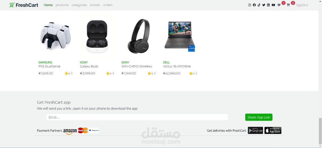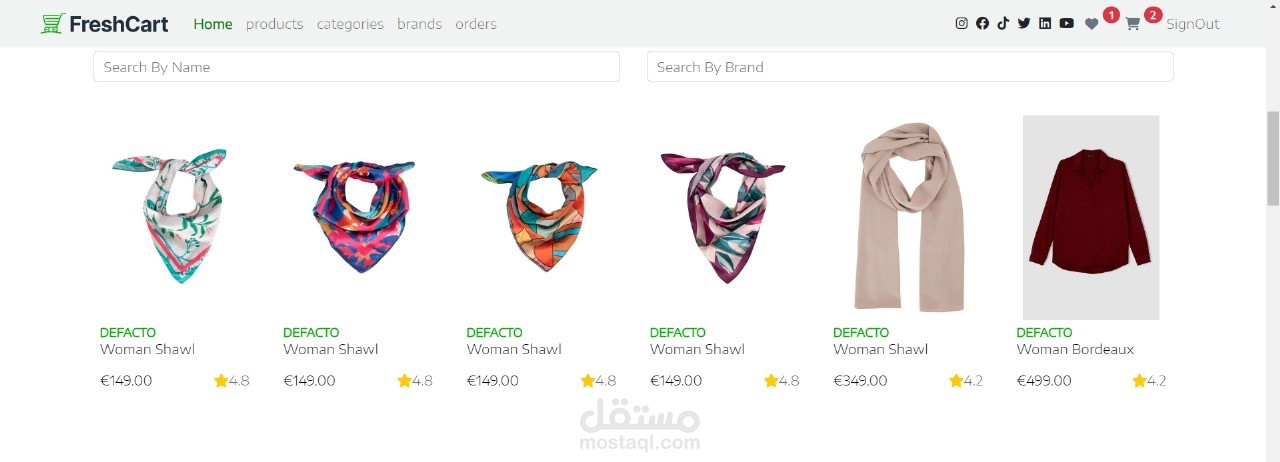 الصفحة الرئيسية: تصفح كافة المنتجات، الفئات، والعلامات التجارية على صفحتنا الرئيسية. يمكنك إضافة أي منتج إلى سلة التسوق، تعديل كمية المنتجات، إضافة المنتجات إلى قائمة المفضلة، والبحث عن أي منتج تريده. نستخدم تقنيات Angular وRXJS لتقديم تجربة تصفح تفاعلية وسلسة.