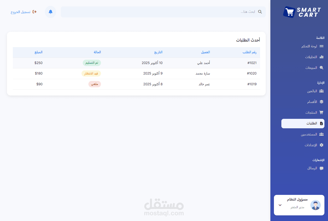HTML و CSS و JavaScript، يشمل تجربة مستخدم كاملة للعميل ولوحة تحكم للإدارة.