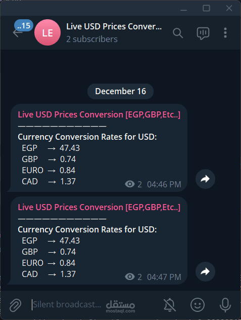 الوظيفة: يقوم البوت تلقائيًا بجلب أسعار الصرف في الوقت الفعلي عبر واجهة برمجية (API) من نوع REST، ويحلل بيانات JSON، ثم يرسل رسالة نظيفة ومجدولة توضح تحويل 1.00 دولار أمريكي إلى العملات العالمية الرئيسية مباشرةً إلى محادثة التلجرام.
