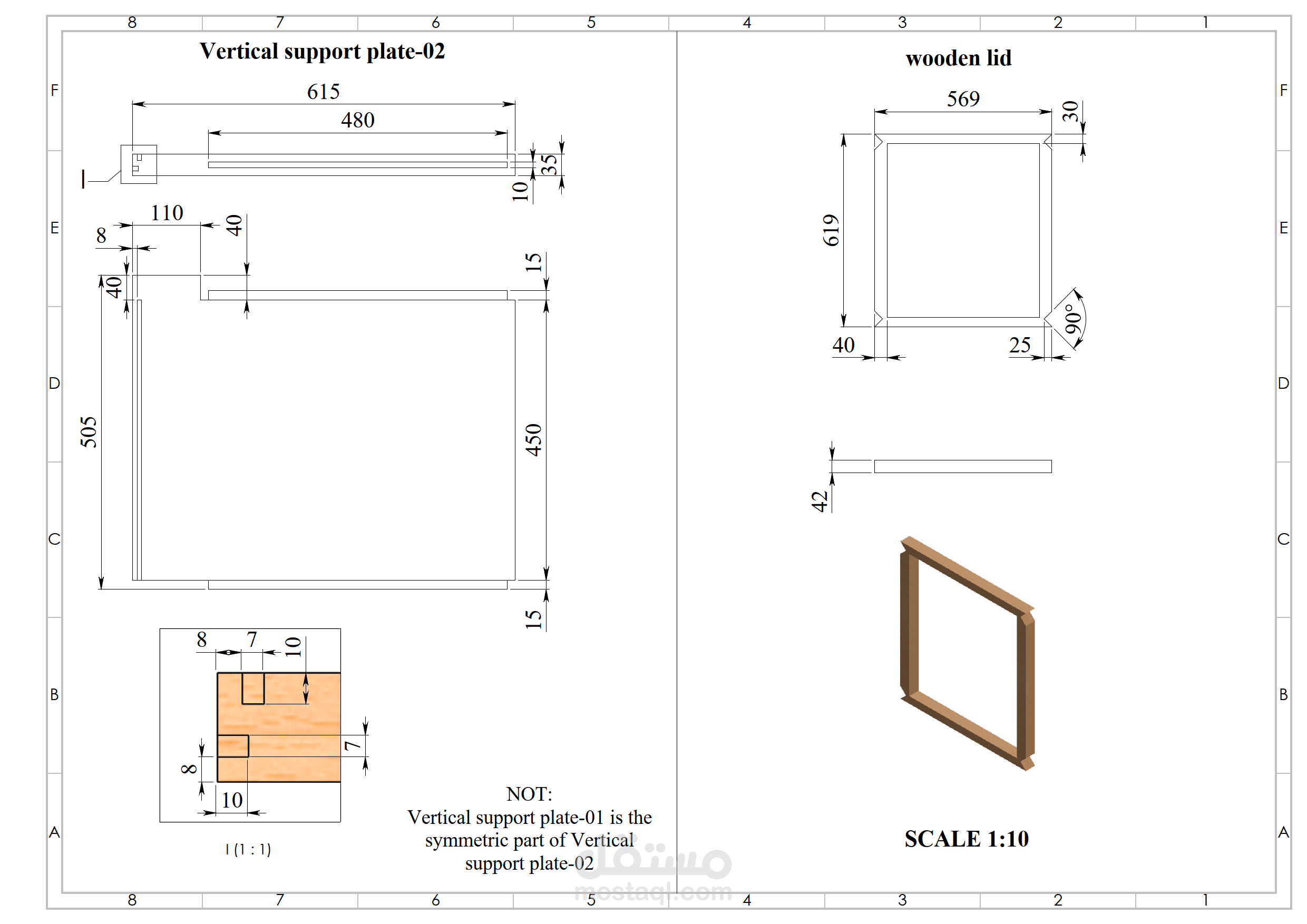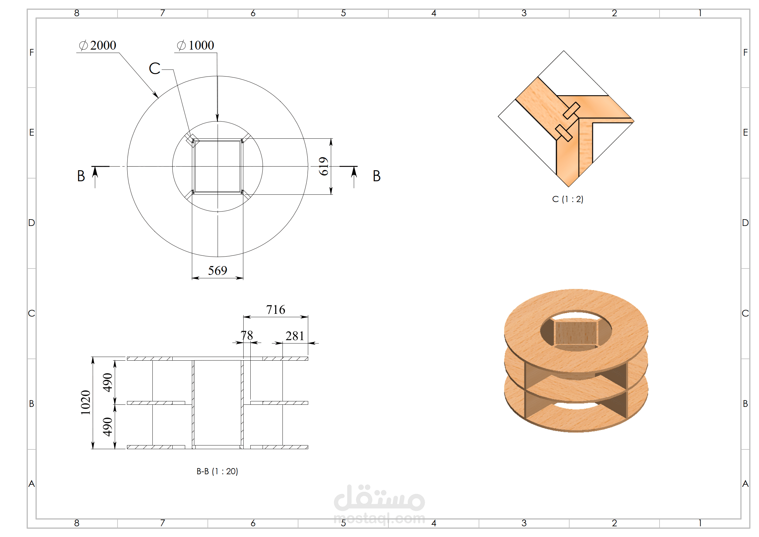 This furniture project showcases an industrial piece designed in SolidWorks. The 3D model was created in SolidWorks, while the 2D layouts were prepared using SolidWorks drawing tools, along with the bill of materials and detailed dimensions.