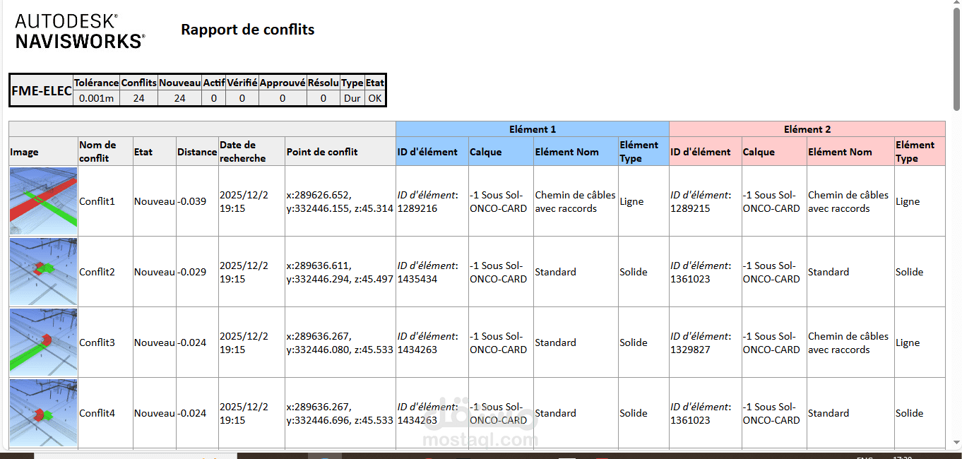 2. التنسيق وحل التعارضات (Clash Resolution): استخدام أدوات متخصصة (مثل Navisworks أو BIM 360) لتحديد التداخلات الحرجة بين المكونات الإنشائية (الأعمدة، الجدران، الأسقف الخرسانية) والمسارات المخصصة لشبكات MEP.