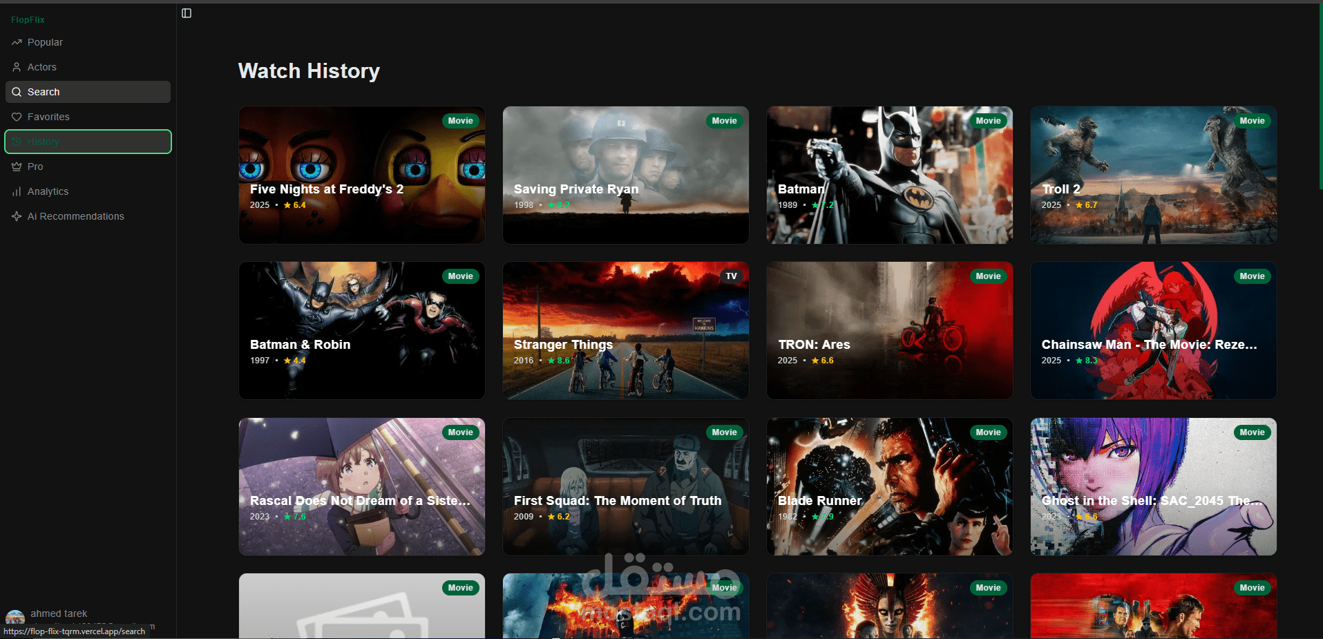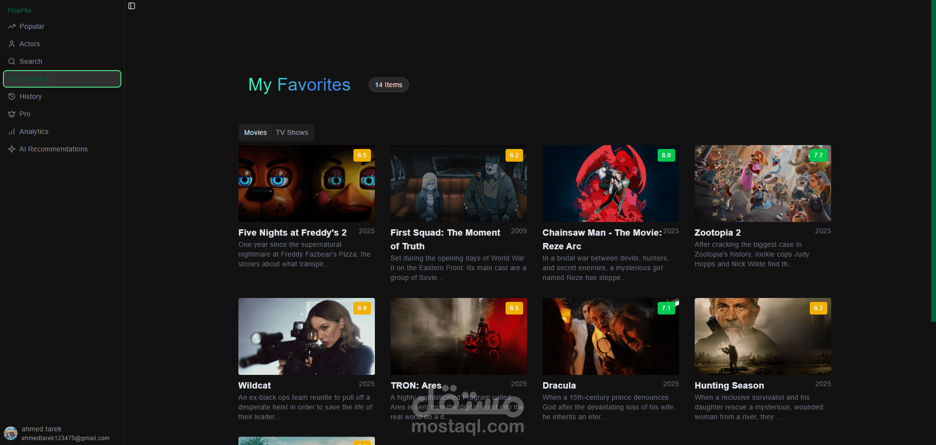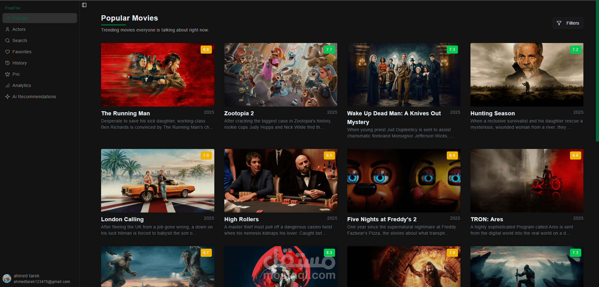 FlopFlix هو تطبيق ويب حديث لاكتشاف الأفلام والمسلسلات التلفزيونية، يوفّر تجربة تفاعلية متكاملة لمحبي السينما والدراما. تم تطوير المشروع باستخدام Next.js 16، React، و TypeScript، مع الاعتماد على واجهة مستخدم عصرية وسلسة تركز على الأداء وتجربة المستخدم.
