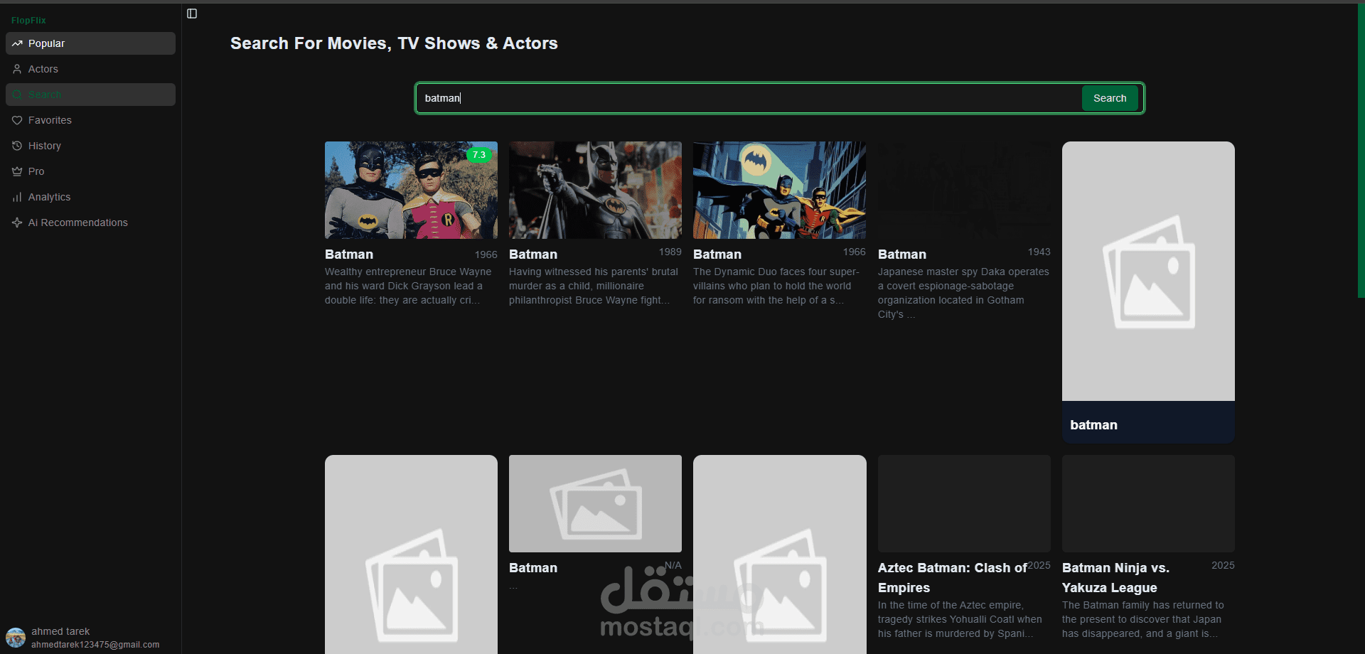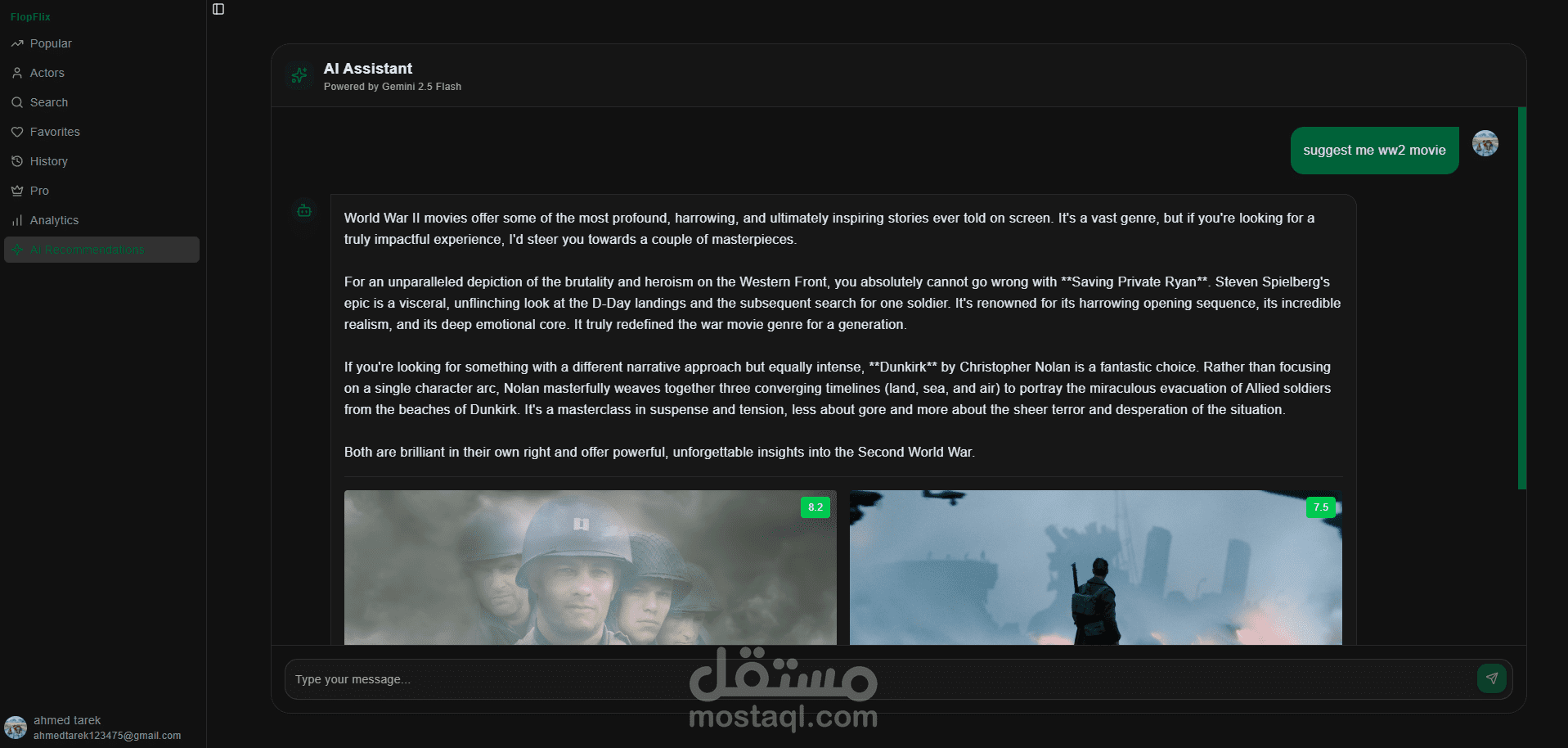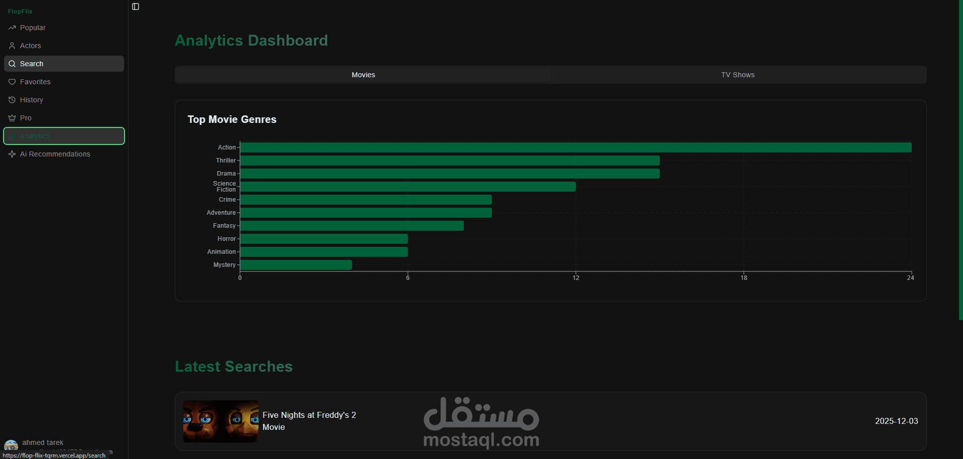 FlopFlix هو تطبيق ويب حديث لاكتشاف الأفلام والمسلسلات التلفزيونية، يوفّر تجربة تفاعلية متكاملة لمحبي السينما والدراما. تم تطوير المشروع باستخدام Next.js 16، React، و TypeScript، مع الاعتماد على واجهة مستخدم عصرية وسلسة تركز على الأداء وتجربة المستخدم.