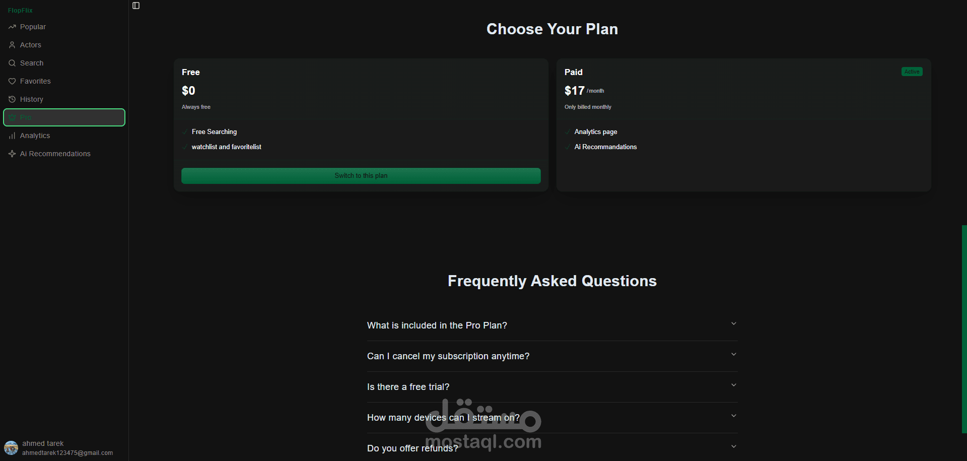 يدعم FlopFlix إدارة الحساب الشخصي من خلال قوائم المفضلة، سجل المشاهدة، المراجعات الشخصية، وتحليلات لعادات المشاهدة. كما يتضمن نظام توصيات ذكي مدعوم بـ Gemini AI يقدم اقتراحات مخصصة، إلى جانب مساعد محادثة تفاعلي لاقتراح المحتوى.