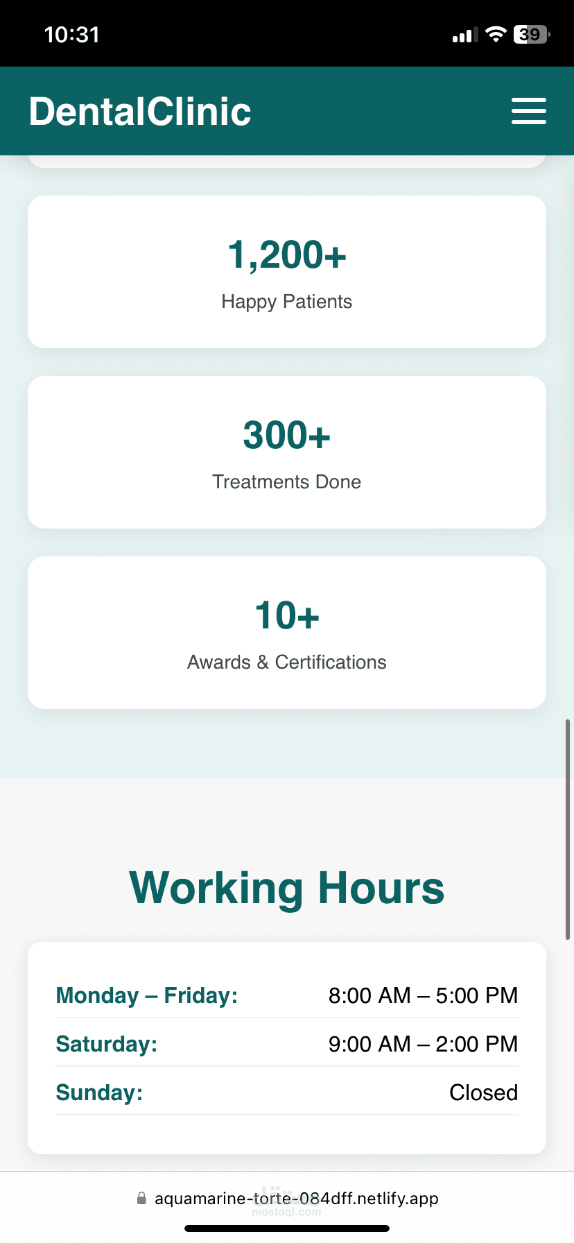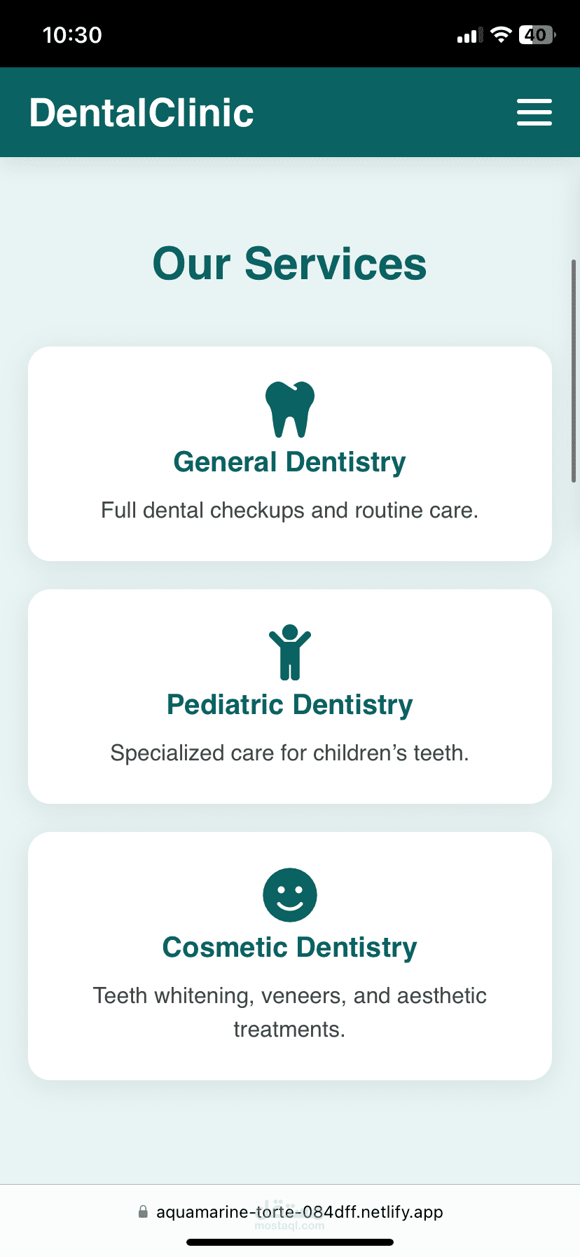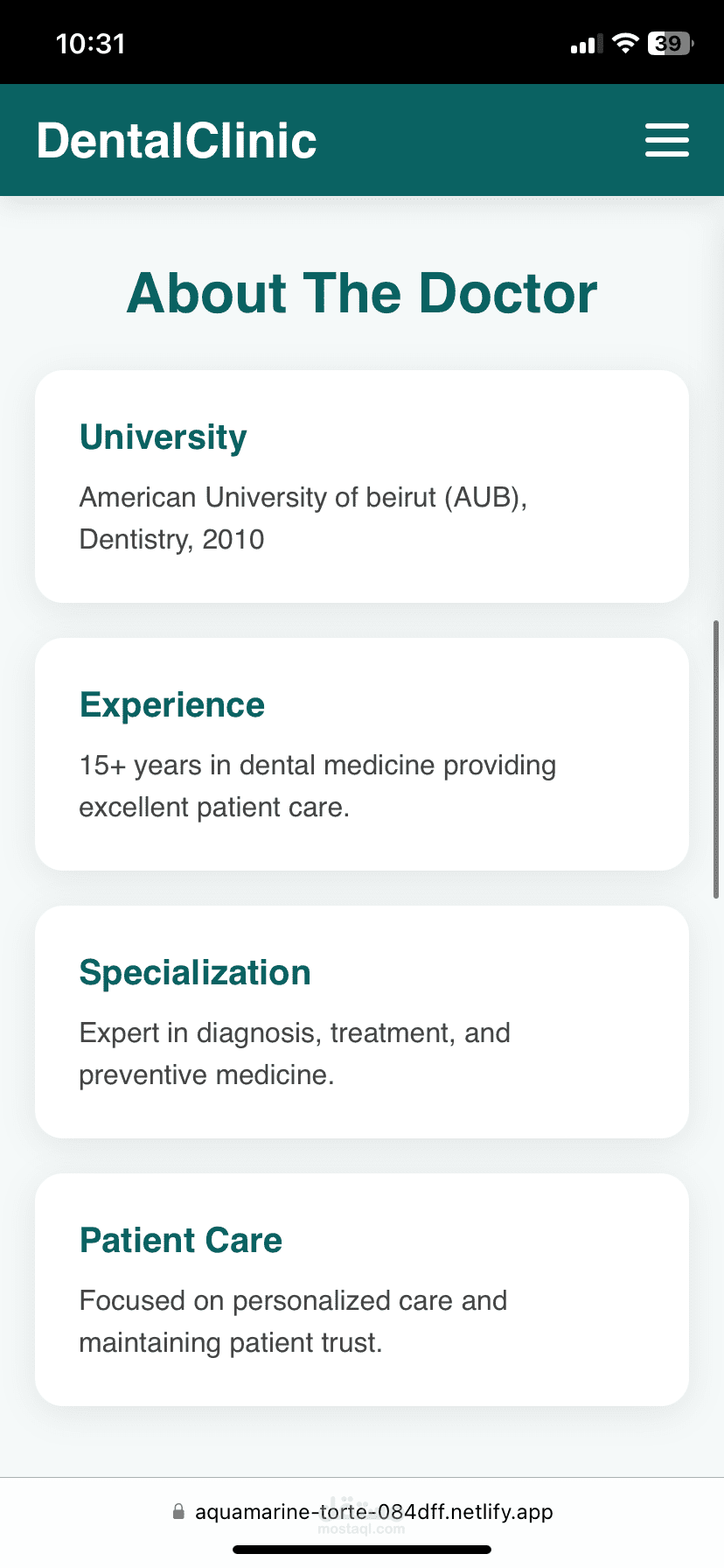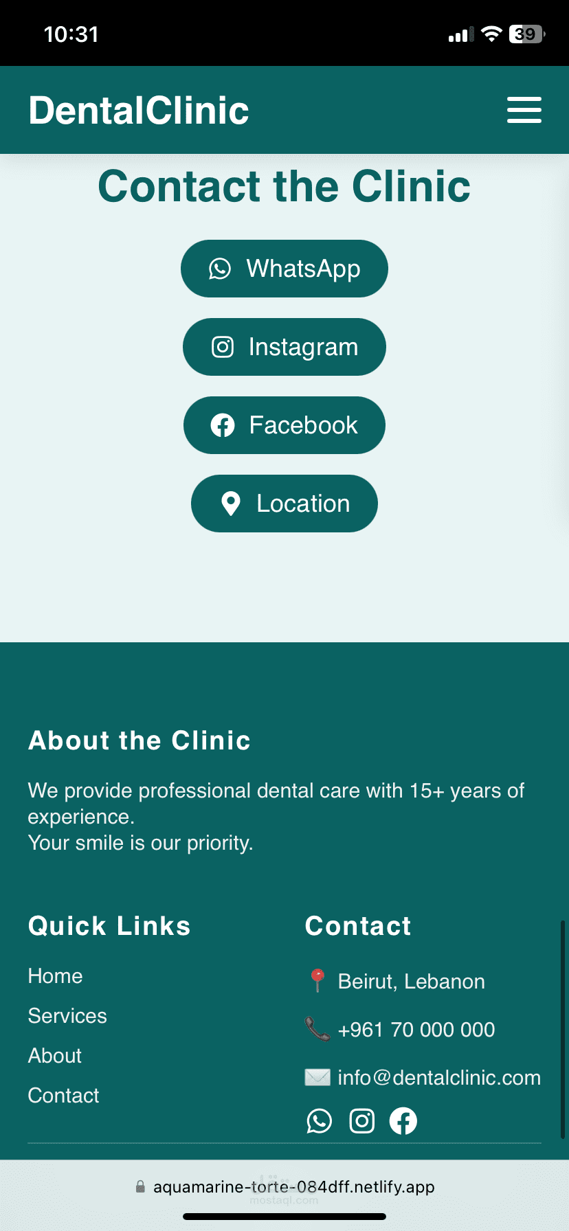 قمتُ بتصميم وتطوير موقع إلكتروني احترافي لعيادة طبيب أسنان يهدف إلى تعزيز الحضور الرقمي للعيادة وتسهيل تواصل المرضى معها، مع التركيز على البساطة، الثقة، وتجربة المستخدم.