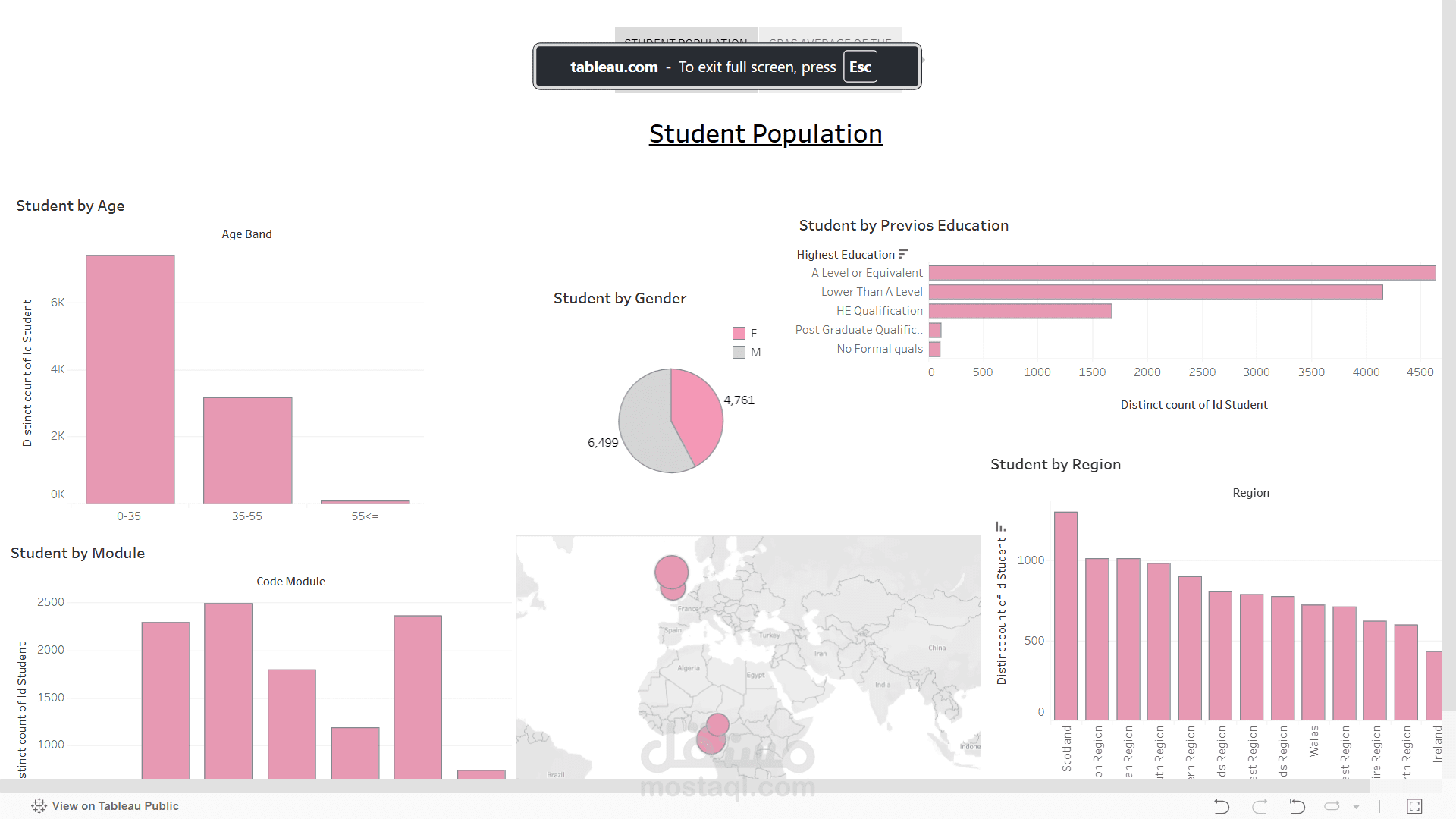 This dashboard analyzes student population data based on age, gender, region, previous education, and enrolled modules. It presents insights through clear visualizations to better understand student demographics and distribution. The dashboard helps identify trends and patterns that can support academic planning and strategic decisions.