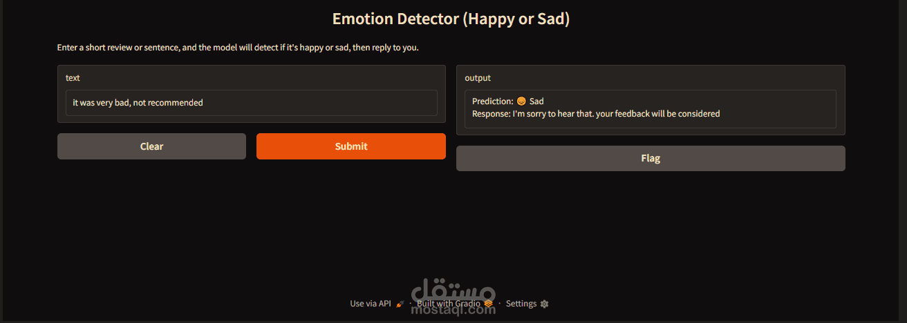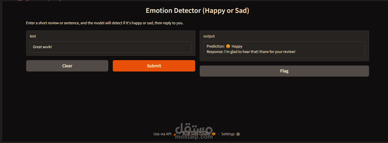 ثم حفظ المودل وتضمينه بصفحة ويب بسيطة(من أجل عرض النتائج بشكل واضح) تم إنشائها باستخدام مكتبة gradio.