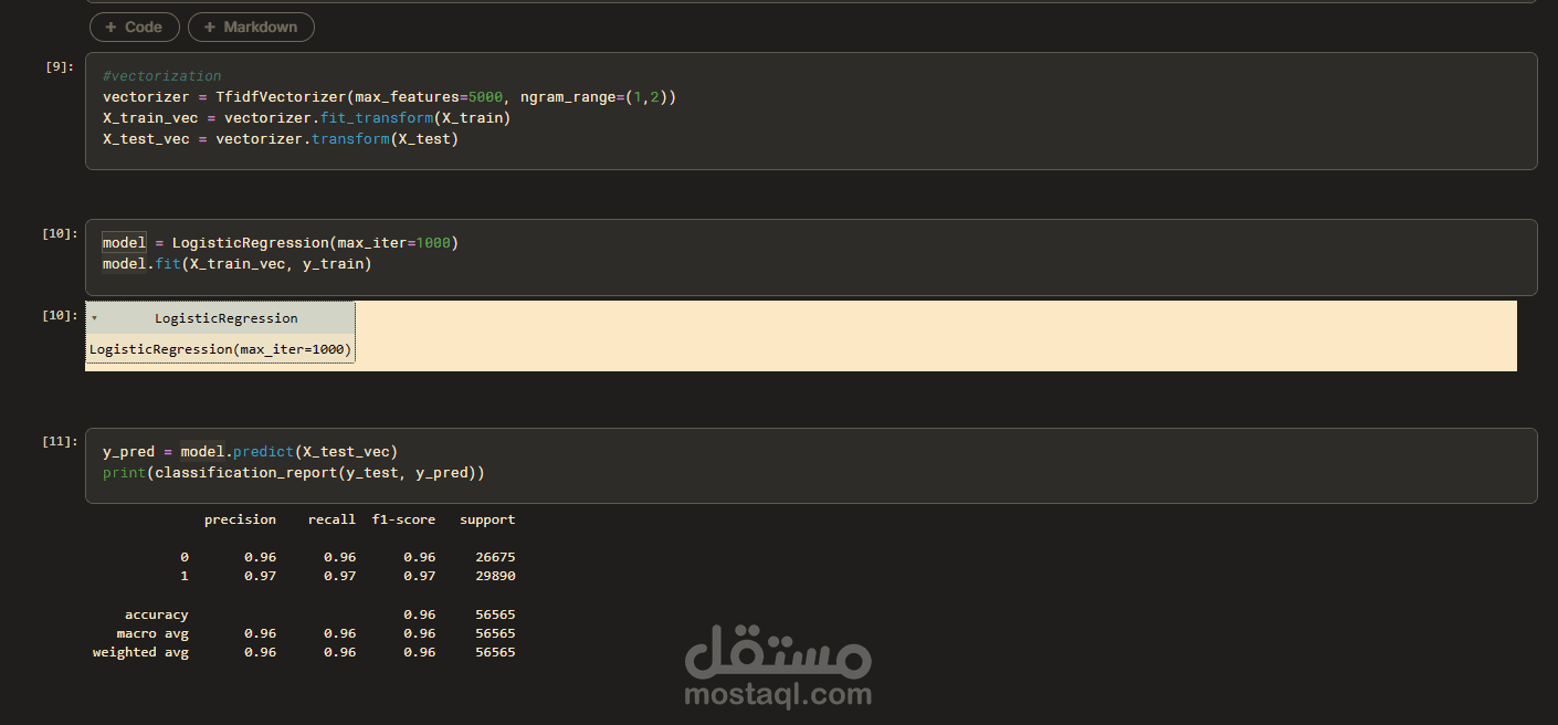 نموذج يحدد فيما إذا كان التعليق أو المراجعة سلبية أو إيجابية باستخدام تعلم الآلة، باستخدام خوارزمية logistic regression ومعالجة النصوص وتحويلها لتضمينات باستخدام TF-IDF vectorizer