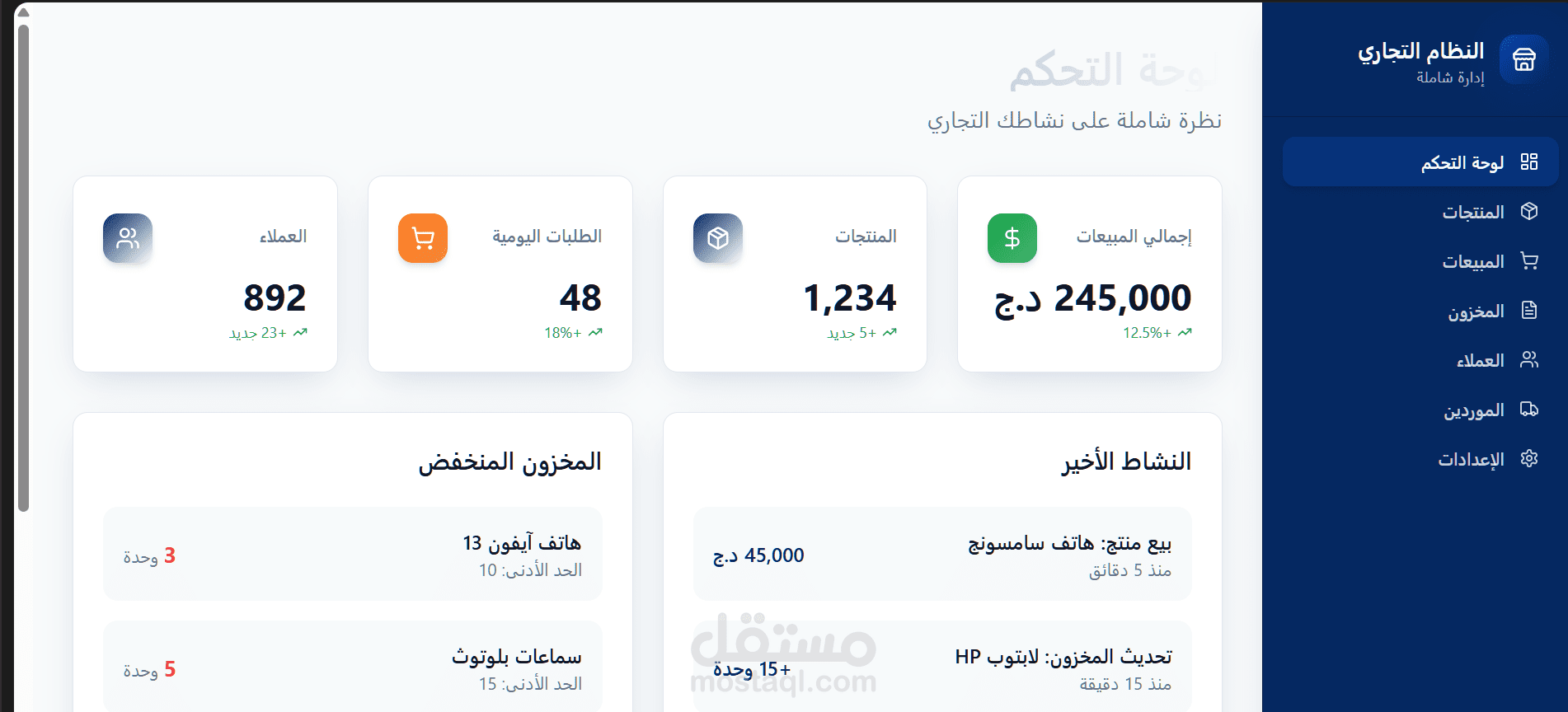 يشمل النظام إدارة المستخدمين، الصلاحيات، والموديولات الأساسية (محاسبة، مخزون، موارد بشرية).