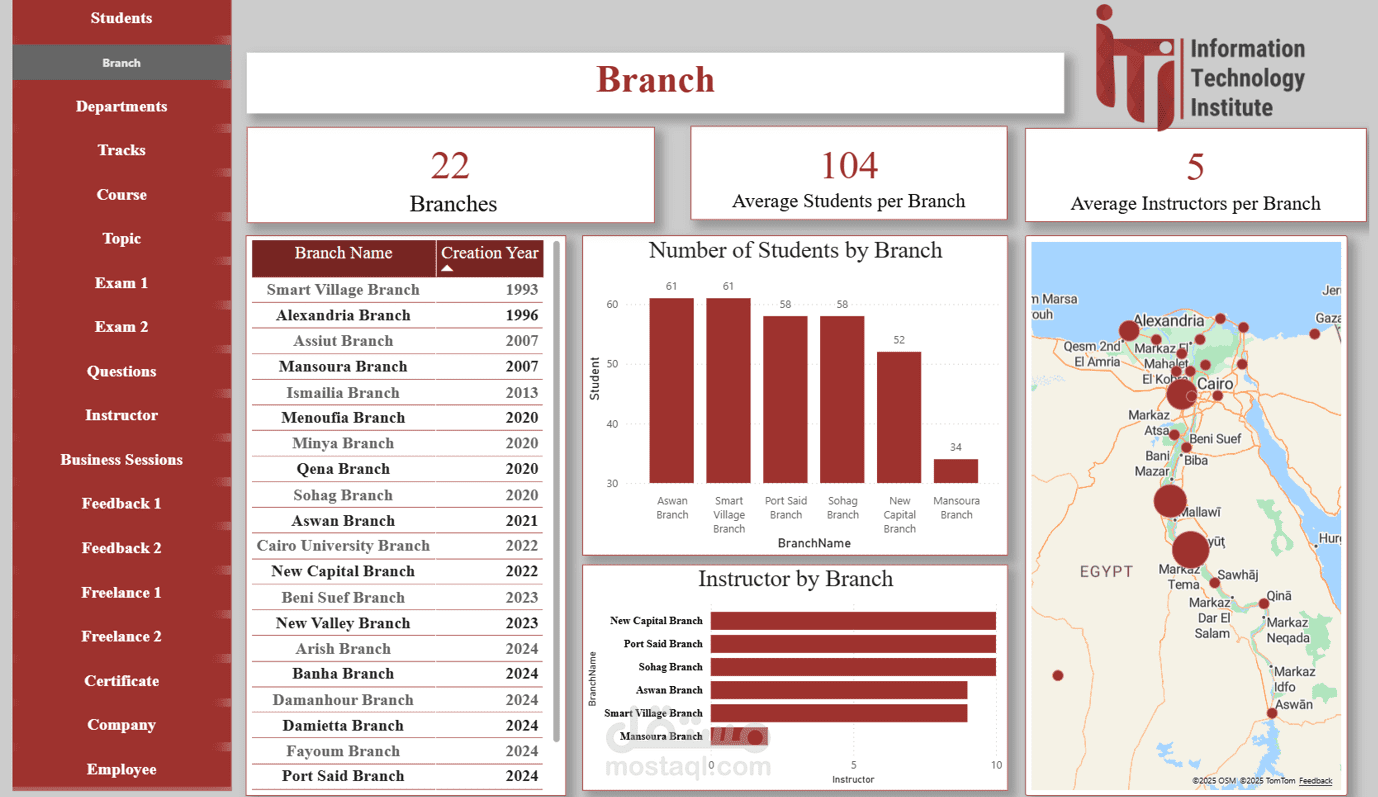 Branch Dashboard: مقارنة الفروع من حيث الأداء، النتائج، وعدد الطلاب.