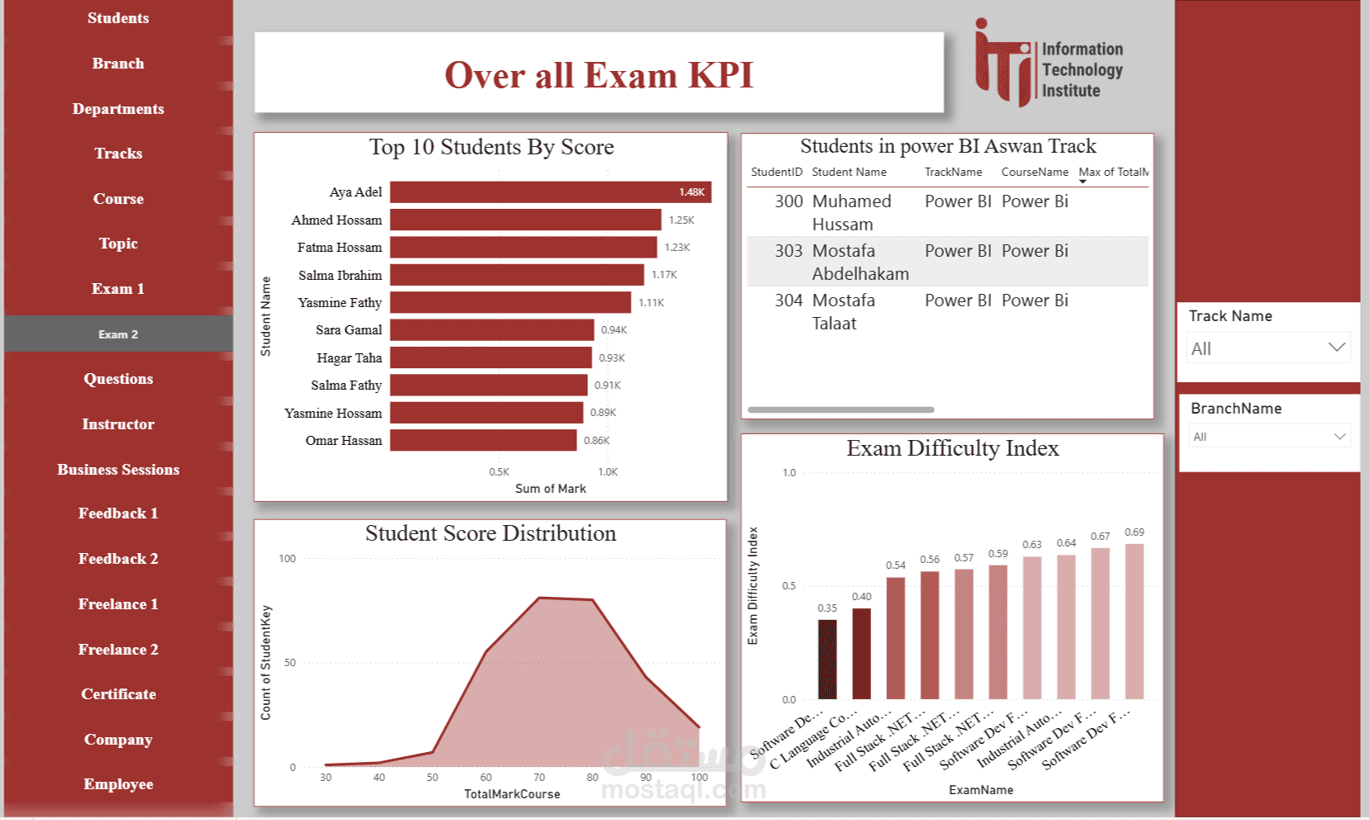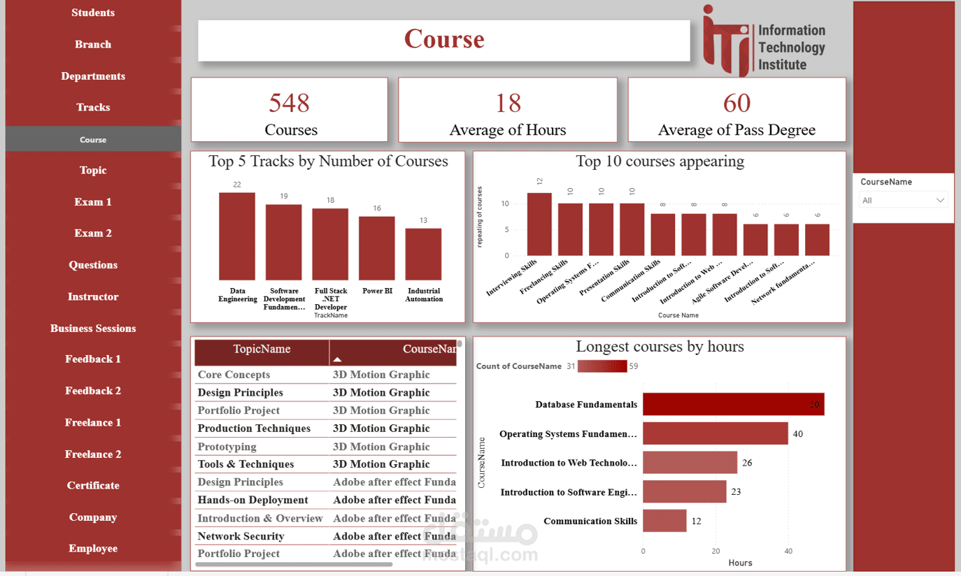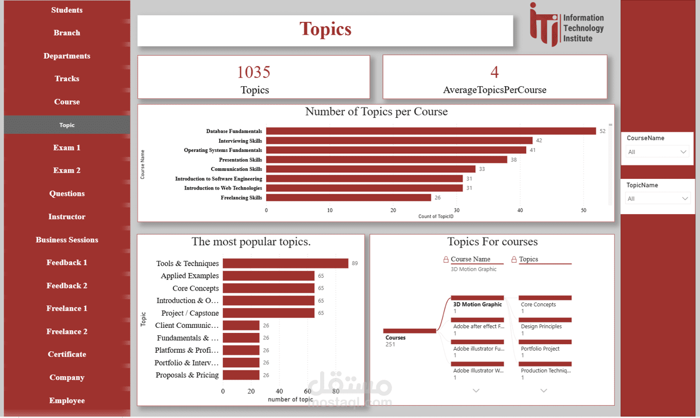 Topic Dashboard: تقييم أداء الموضوعات داخل كل كورس وتحديد نقاط الضعف.