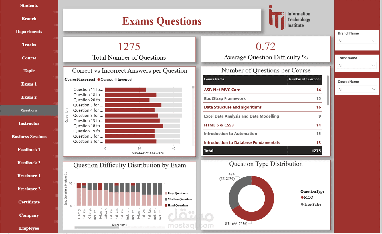 Question Dashboard: تحليل أداء الأسئلة، مستوى الصعوبة، ونسبة الإجابات الصحيحة.