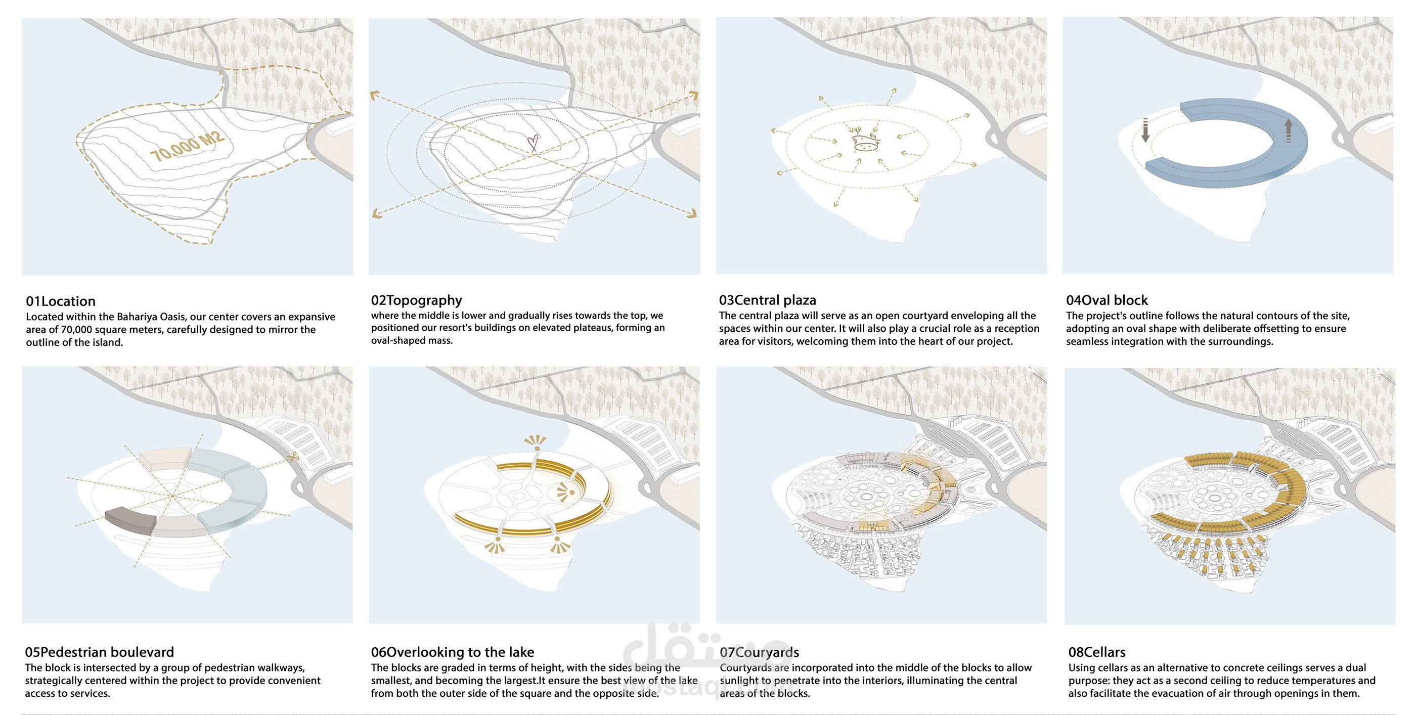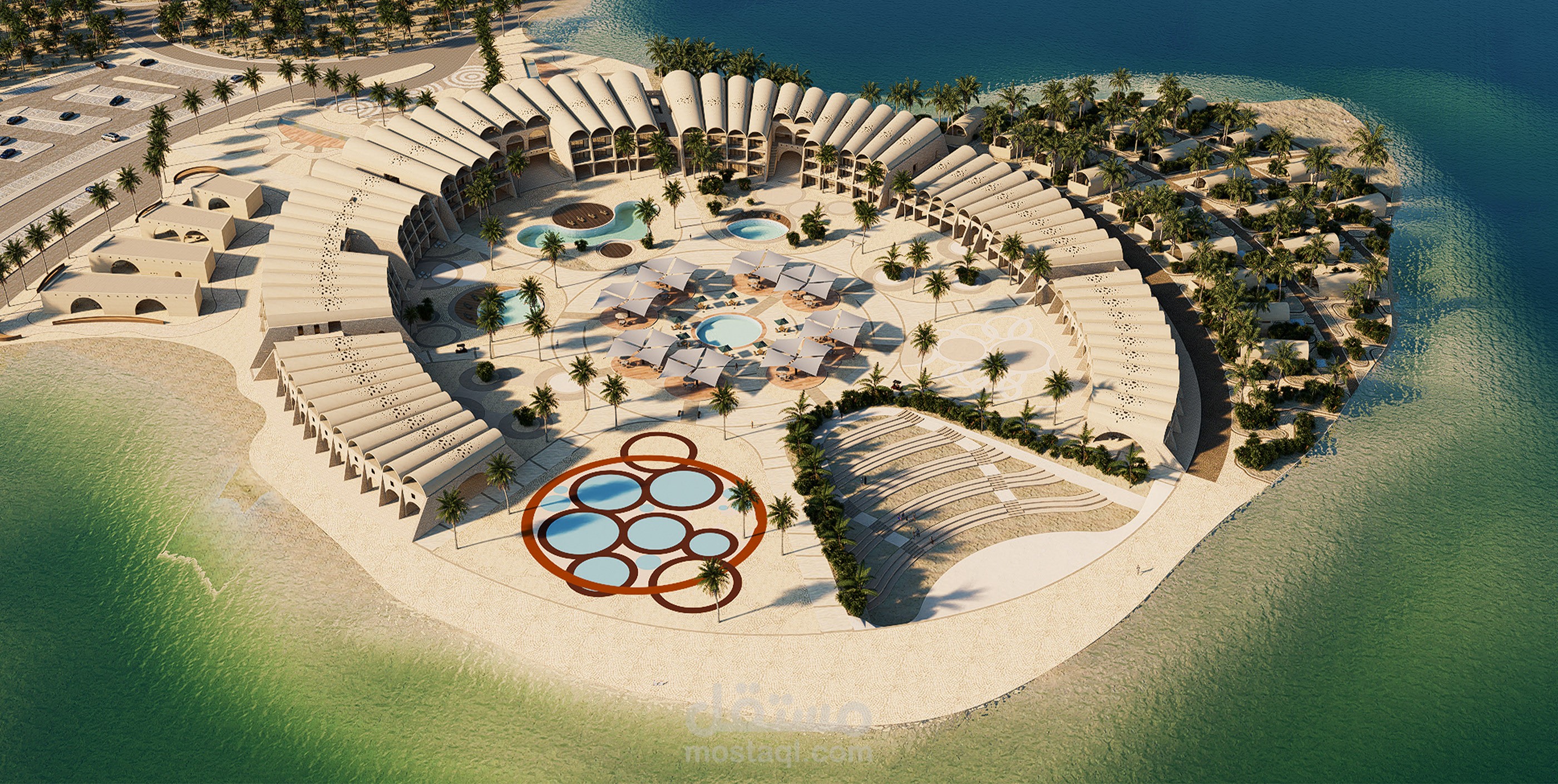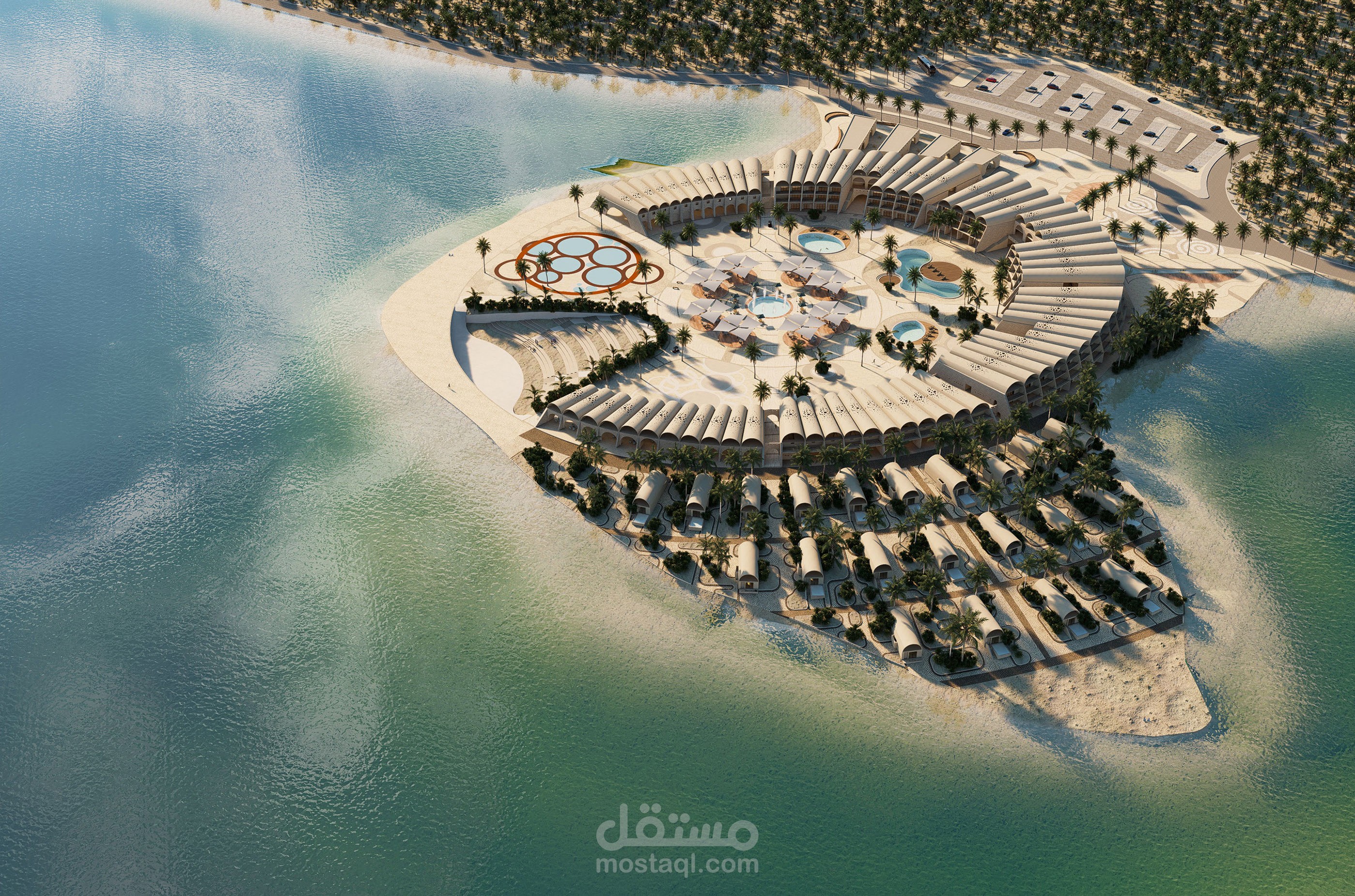 احترامًا للتكوين الطبيعي للأرض، تم توزيع مباني المنتجع بعناية فوق مصاطب مرتفعة تتبع الارتفاع الطبوغرافي المتدرّج من المركز نحو الأطراف، لتشكّل كتلة عمرانية بيضاوية الشكل. ويسهم هذا التنظيم في تعزيز التوازن البصري، والتهوية الطبيعية، وتوفير إطلالات بانورامية واسعة على المشهد الصحراوي.