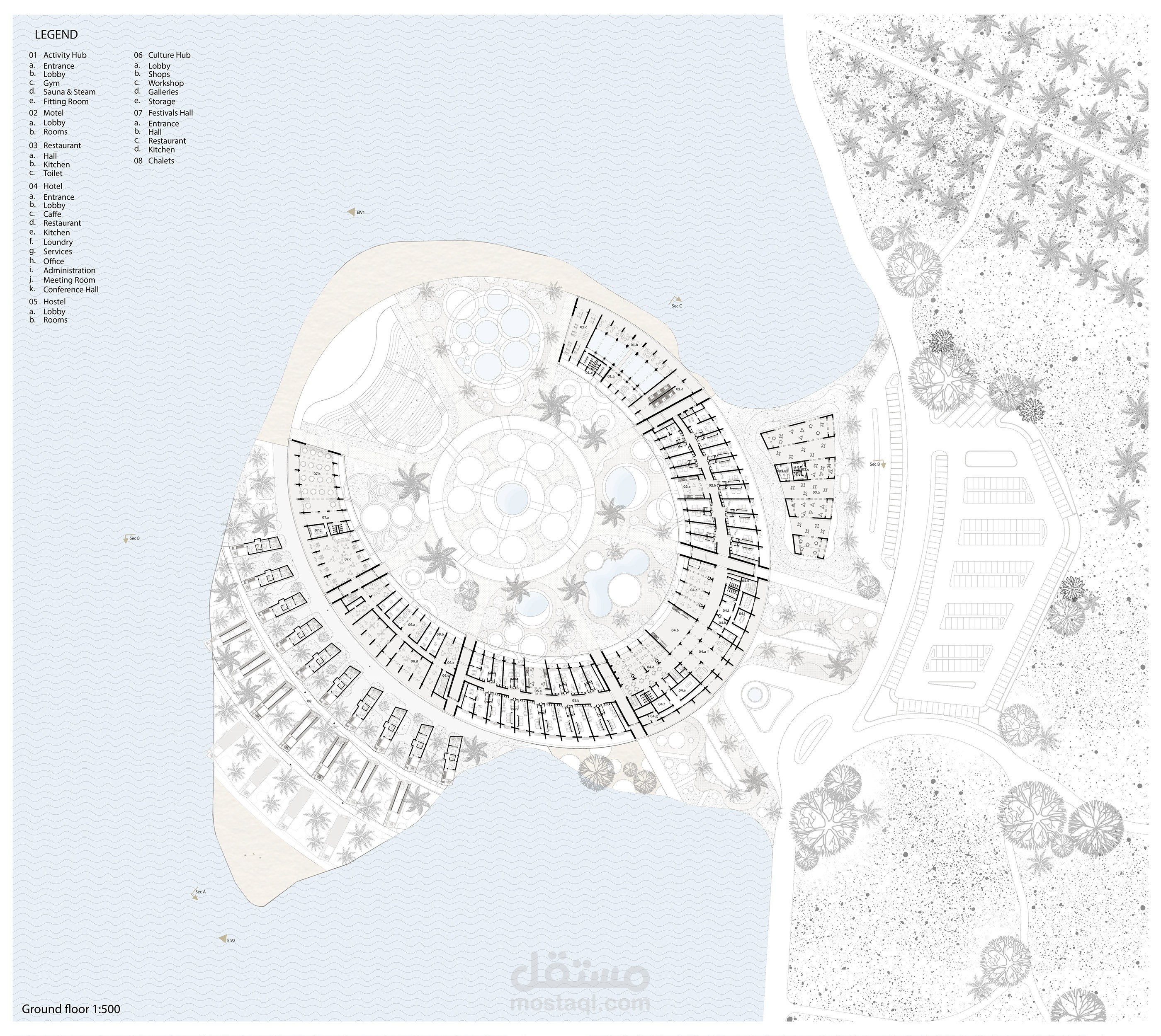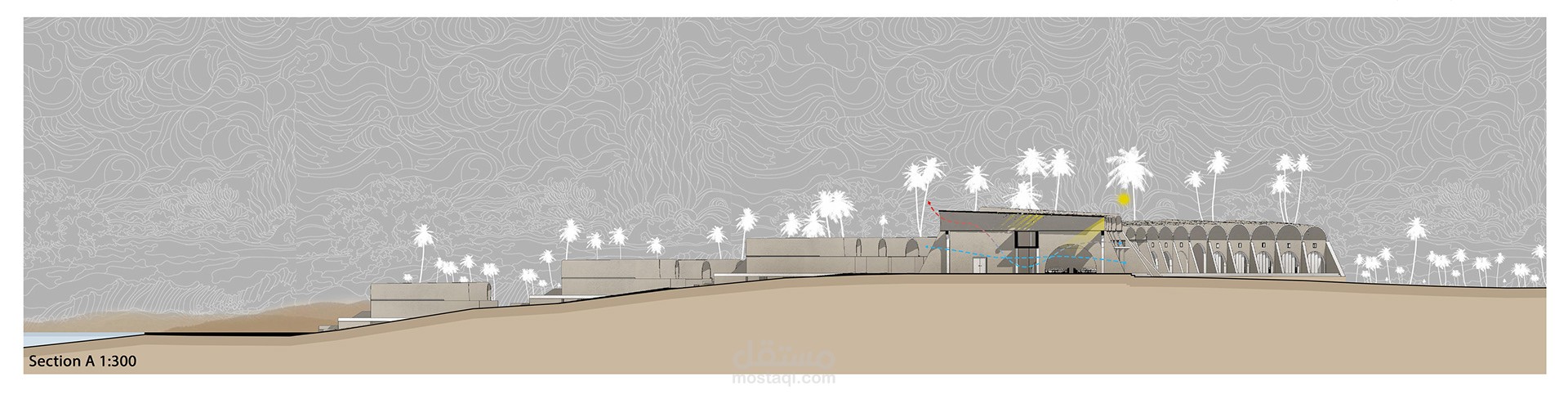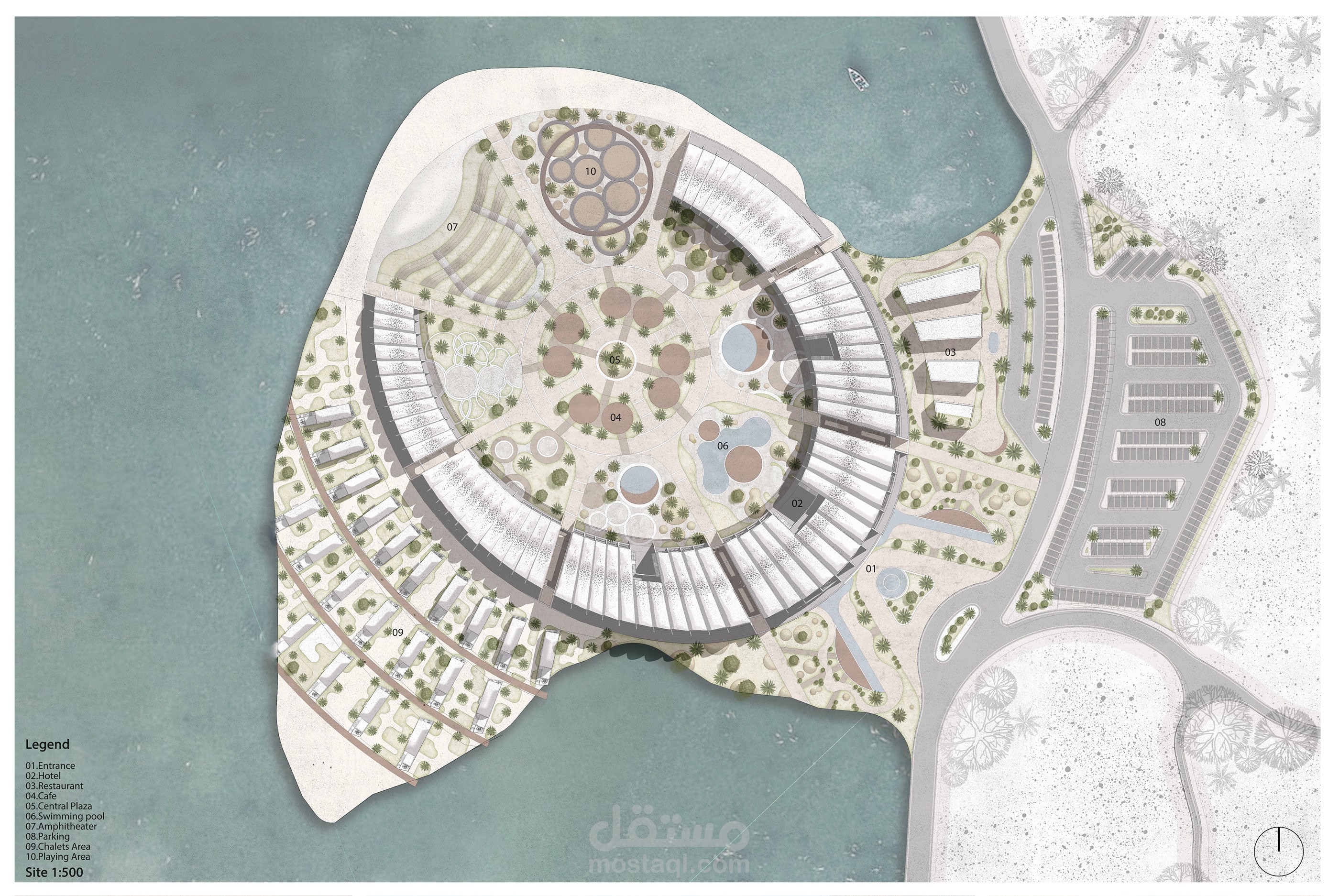 احترامًا للتكوين الطبيعي للأرض، تم توزيع مباني المنتجع بعناية فوق مصاطب مرتفعة تتبع الارتفاع الطبوغرافي المتدرّج من المركز نحو الأطراف، لتشكّل كتلة عمرانية بيضاوية الشكل. ويسهم هذا التنظيم في تعزيز التوازن البصري، والتهوية الطبيعية، وتوفير إطلالات بانورامية واسعة على المشهد الصحراوي.