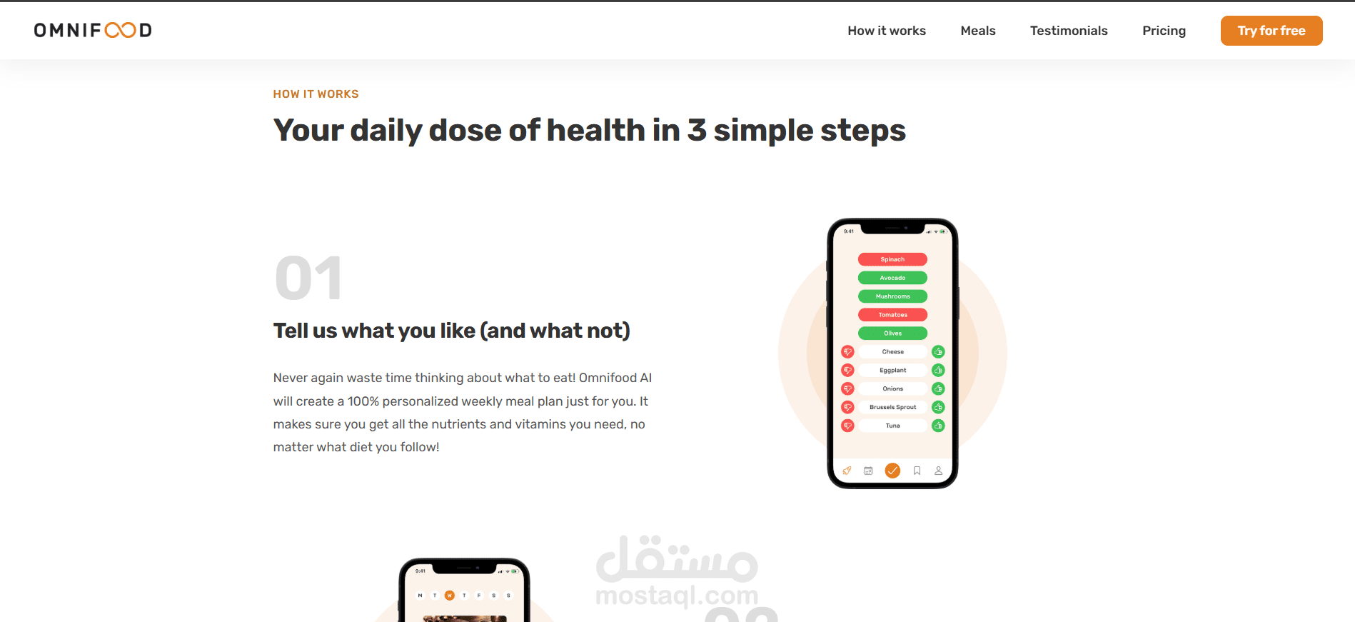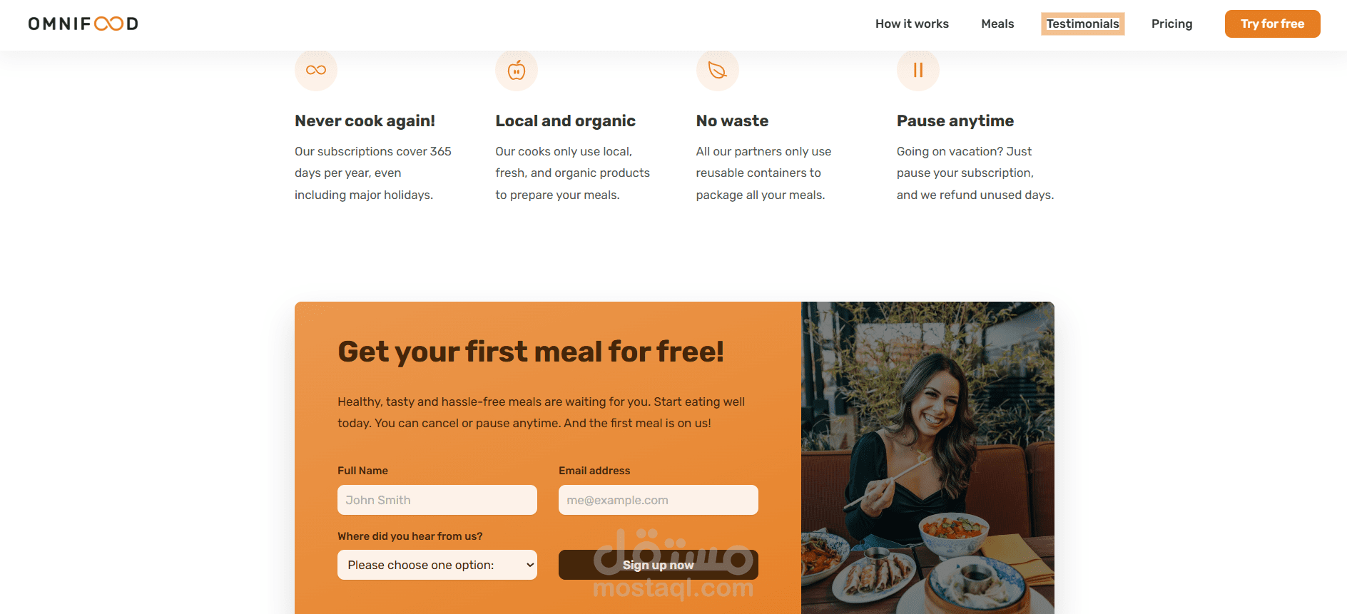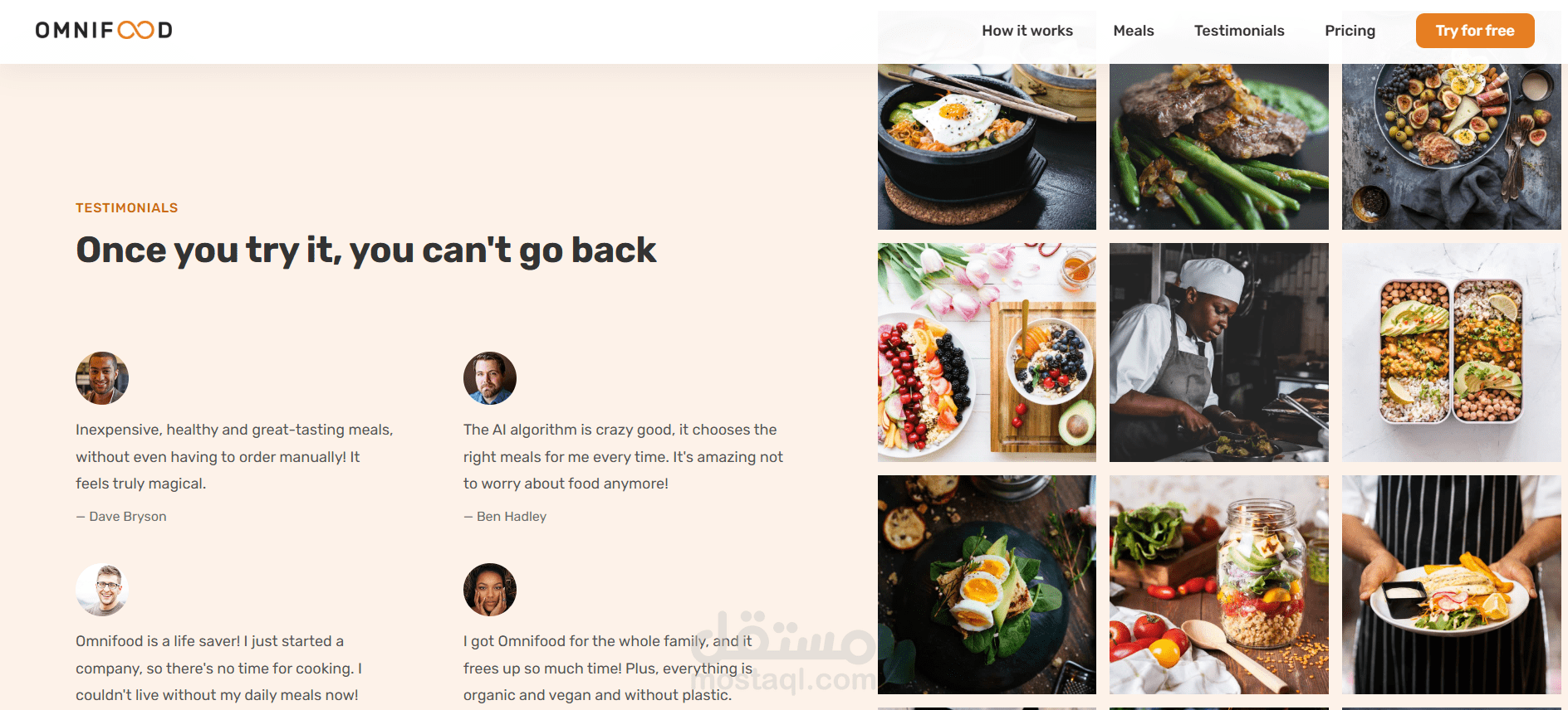 مشروع Omnifood هو موقع ويب احترافي عبارة عن صفحة هبوط تسويقية مخصّصة لخدمة اشتراك في الوجبات الغذائية الصحية. يقدّم الموقع تجربة استخدام مميزة من خلال تصميم عصري ومتجاوب يعمل بكفاءة على جميع الأجهزة (كمبيوتر – تابلت – موبايل).