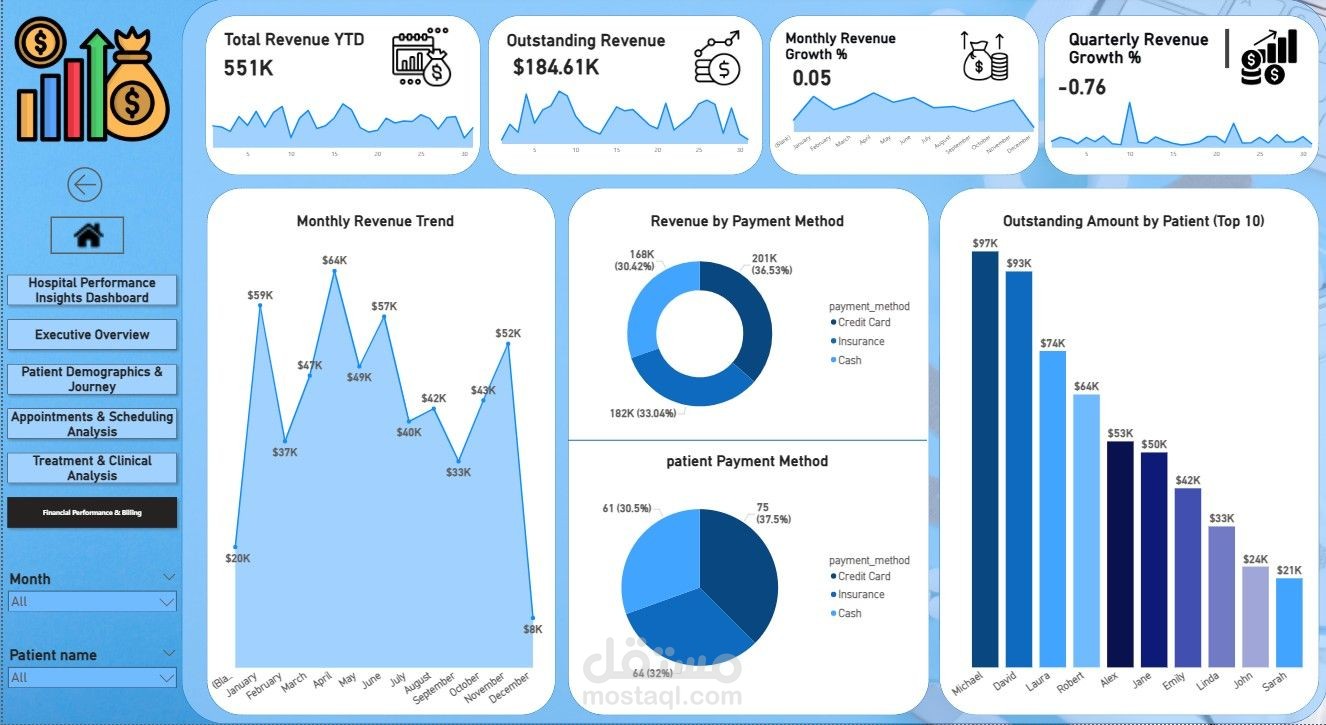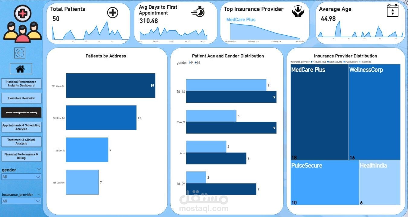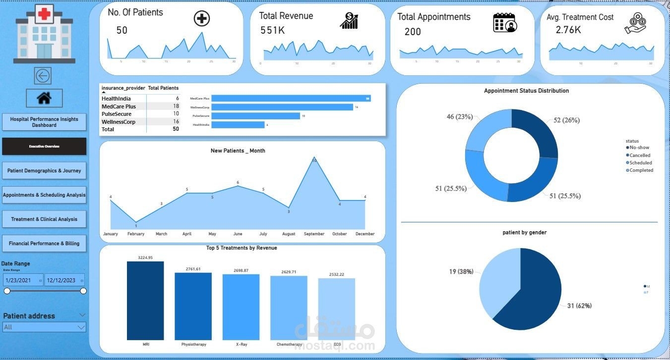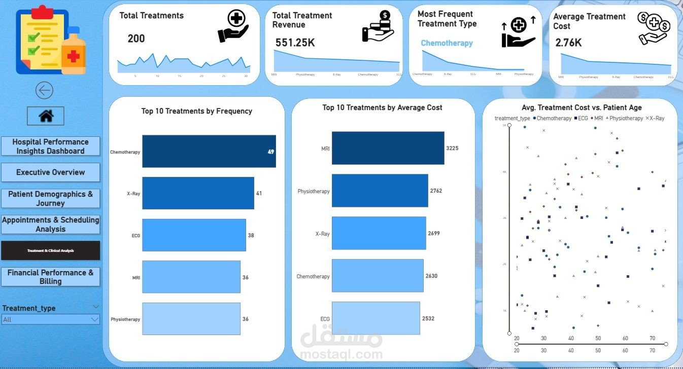 لوحة تحكم تحليلية لمتابعة أداء المستشفى تشمل رحلة المريض، المواعيد، العلاجات، والإيرادات، بهدف تحسين الكفاءة التشغيلية وتقليل No-Show وزيادة التحصيل المالي.
