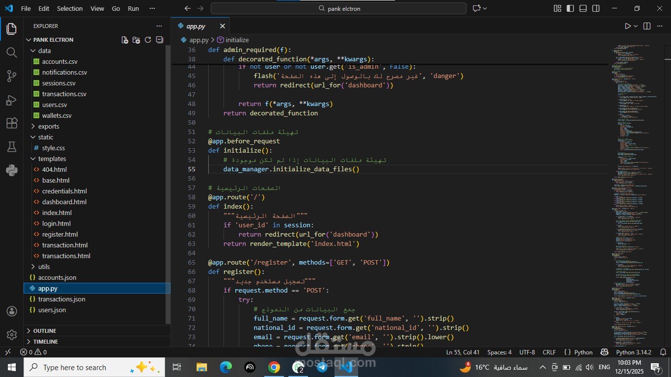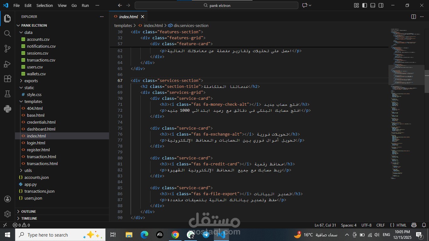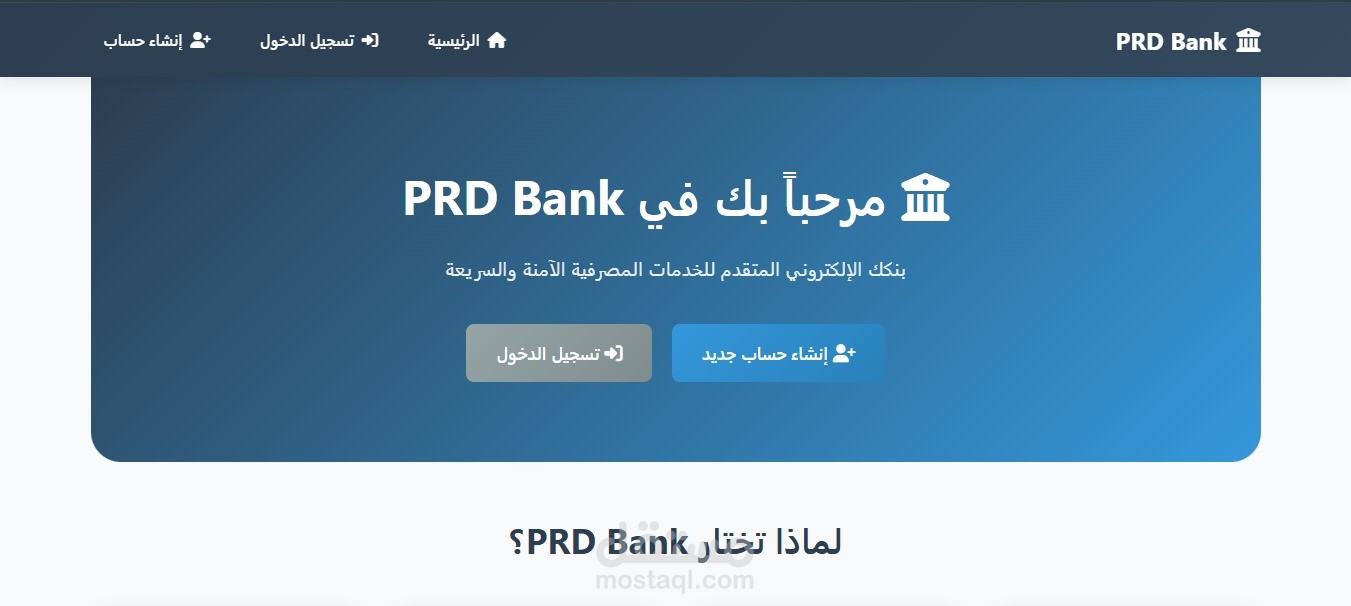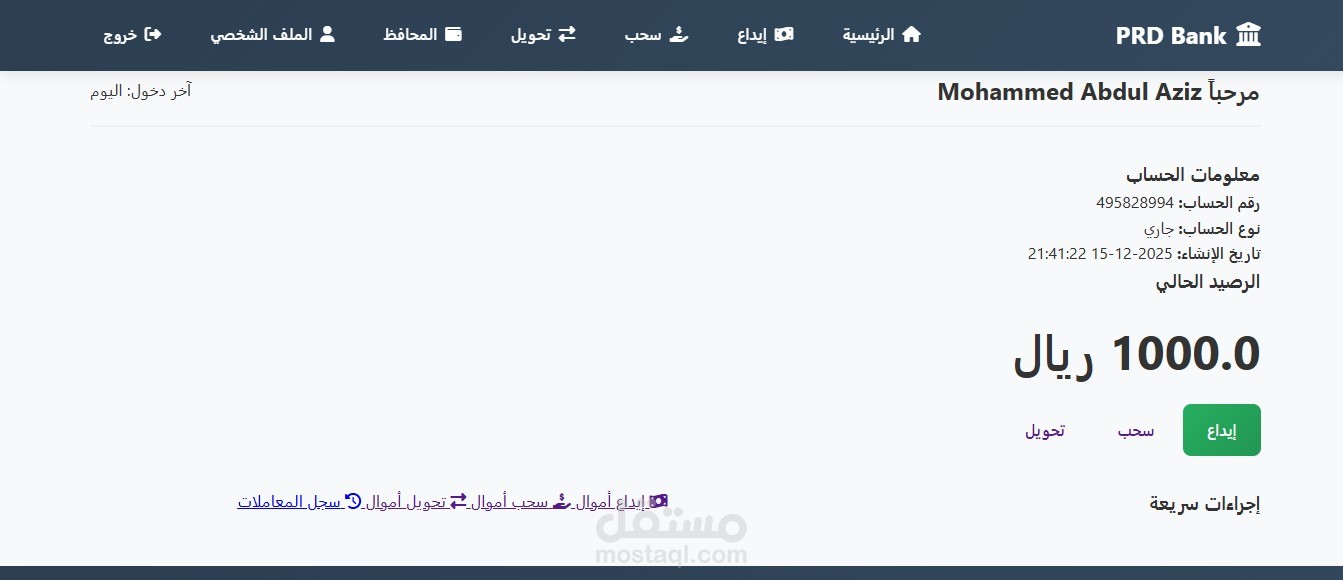 تطوير نظام بنكي متكامل باستخدام Flask يشمل تسجيل المستخدمين، إدارة الحسابات البنكية، تسجيل الدخول الآمن، الإيداع والسحب والتحويل، إدارة المحافظ الإلكترونية، سجل المعاملات مع التصدير (CSV/Excel/PDF)، لوحات تحكم وإحصائيات، إعدادات أمان، وإشعارات داخلية. النظام يعتمد على هيكلة واضحة، تحقق صارم من البيانات، تشفير كلمات المرور، وإدارة جلسات المستخدمين، مع واجهات مستخدم منظمة وداعمة للغة العربية.