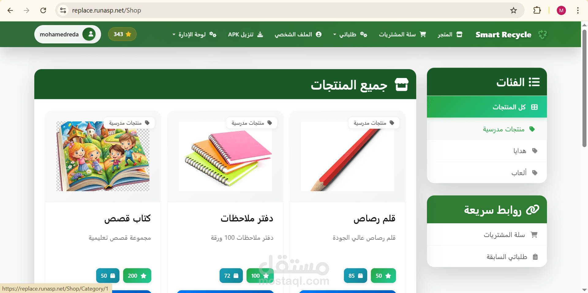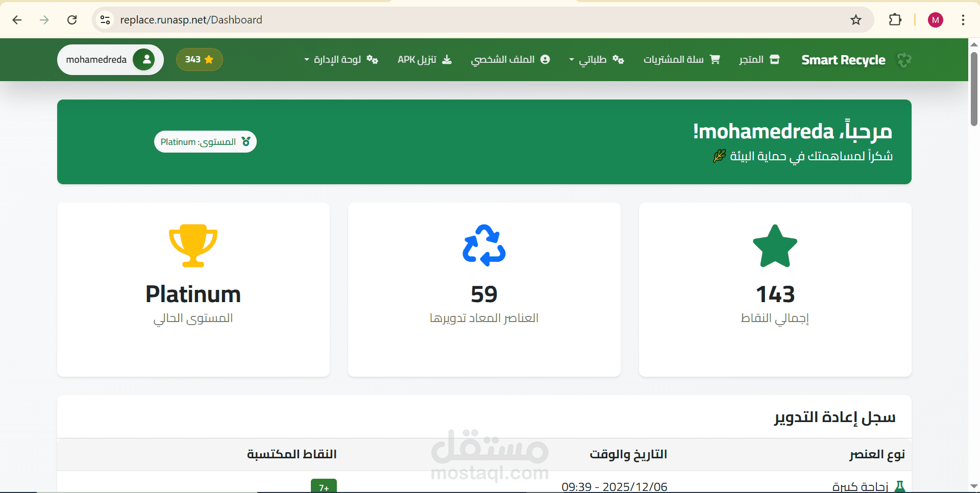 منصة متكاملة مرتبطة بماكينات إعادة تدوير ذكية، تتيح للمستخدمين تحويل الزجاجات البلاستيكية والعلب المعدنية إلى نقاط قابلة للاستبدال بمنتجات من خلال موقع إلكتروني.