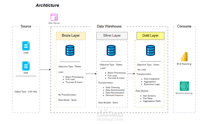 To design and implement a robust, scalable, and well-documented SQL Server-based data warehouse that ingests, transforms, and models data from heterogeneous sources (CRM & ERP), enabling downstream analytics and reporting for business stakeholders.