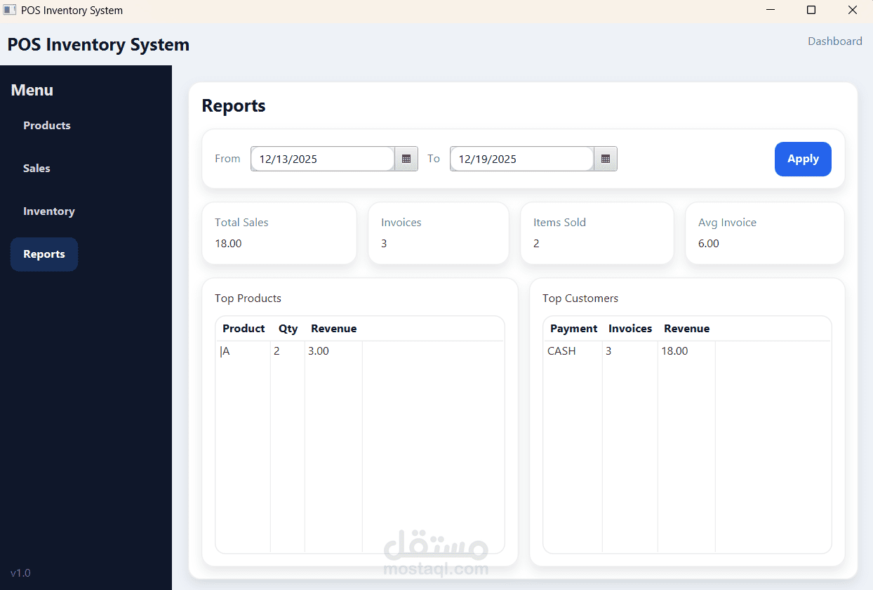 - تقارير احترافية (يومية، شهرية، متوسط الفاتورة)