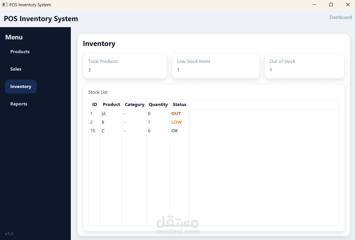 - تتبع المخزون مع حالات (OK / LOW / OUT)