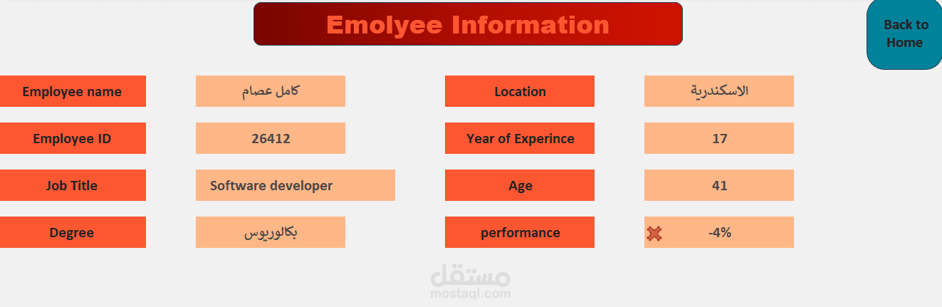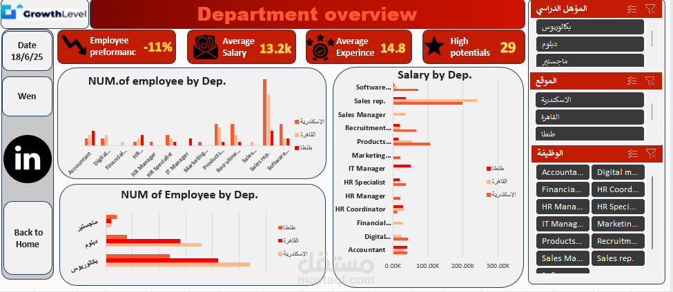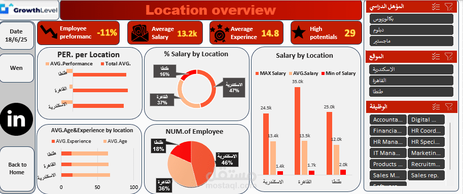 A dynamic Excel dashboard built to diagnose a critical 11% drop in employee performance across key Egyptian branches (Cairo, Alexandria, Tanta). This analysis empowered HR leadership with actionable insights into salary disparities, experience gaps, and department-level trends, culminating in a tool for proactive talent management.