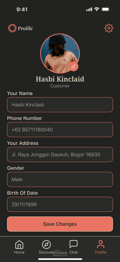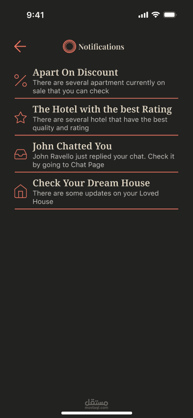 التصميم يتبع نمط الـ Dark Mode بلمسات برتقالية هادئة، مما يعطي طابعاً فخماً ومريحاً للعين.