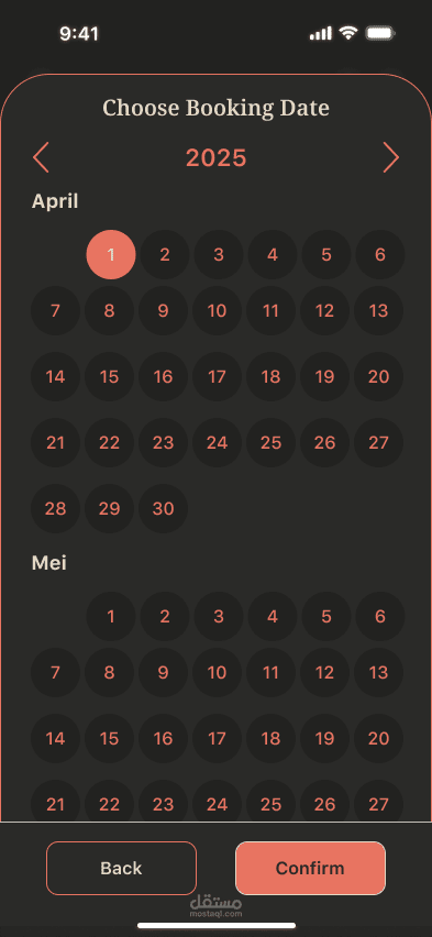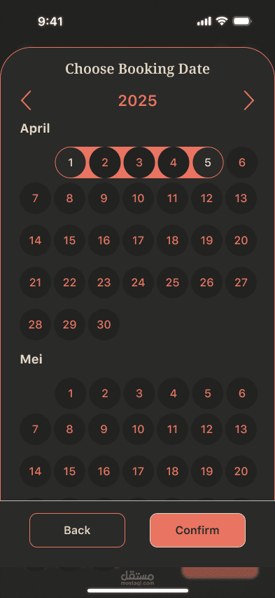 تقويم تفاعلي لاختيار تواريخ الوصول والمغادرة.