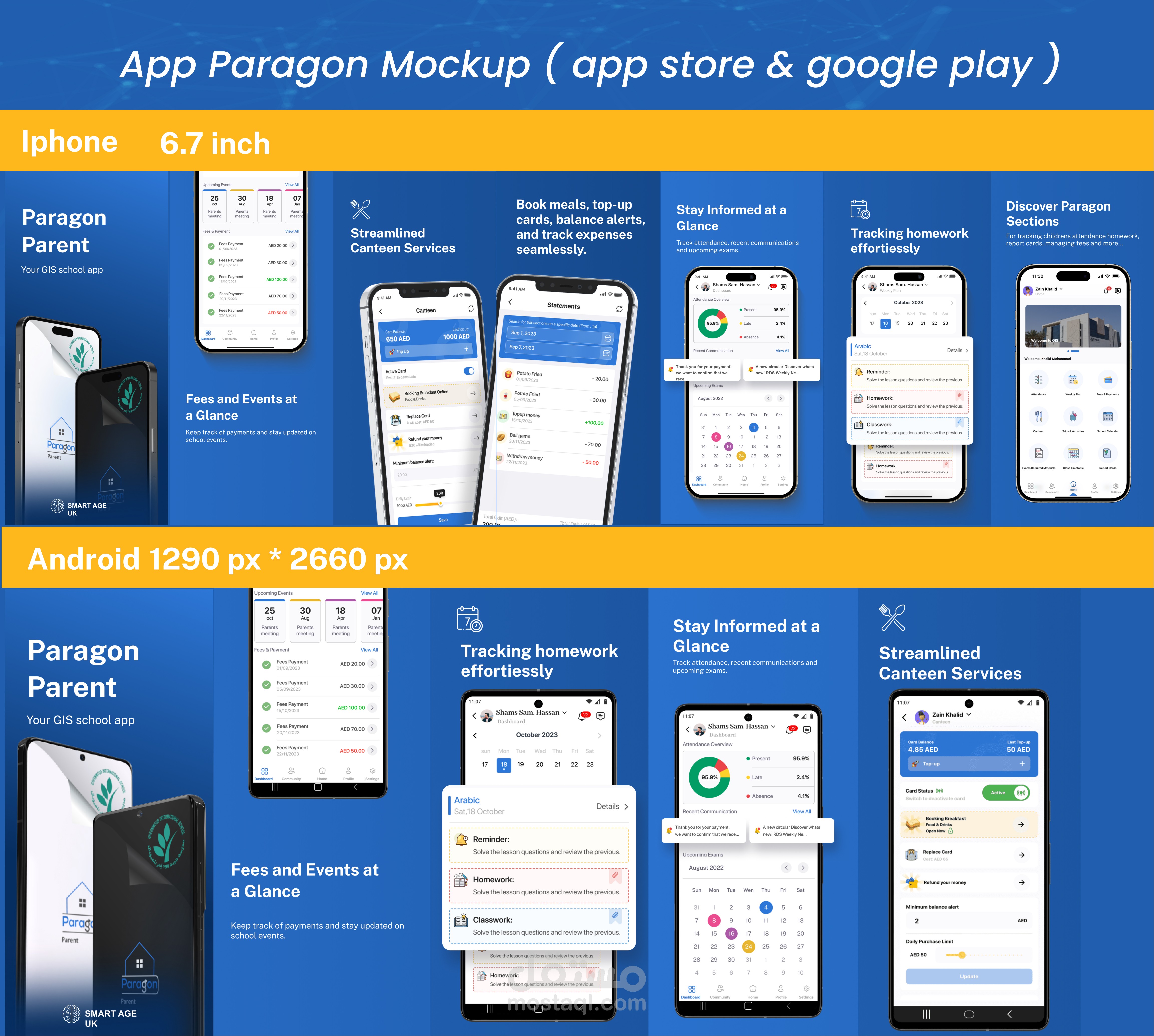 تم تصميم واجهات التطبيق بأسلوب عصري وسهل الاستخدام، مع توافق كامل مع App Store وGoogle Play لكل من أجهزة iPhone وAndroid، لضمان تجربة مستخدم سلسة وواضحة تساعد أولياء الأمور على البقاء على اطلاع دائم بكل ما يخص أبنائهم بكل سهولة وأمان.