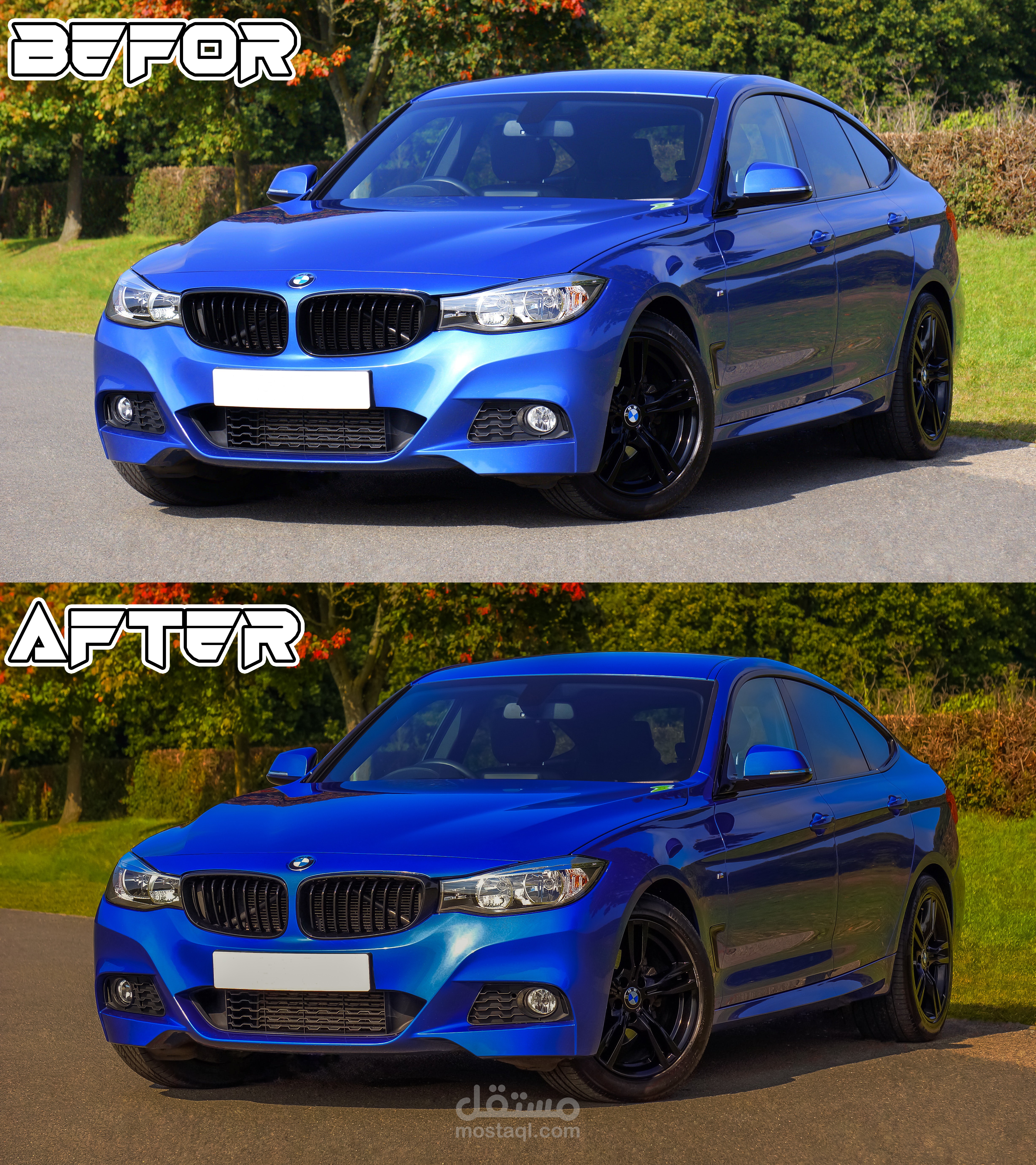 This work showcases a professional car photo enhancement with a clear before-and-after comparison.