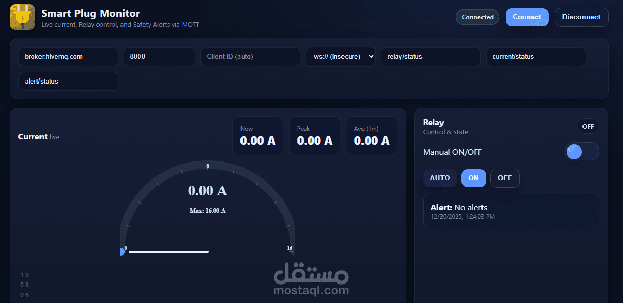 قمت بتصميم وتنفيذ نظام Smart Plug Monitor لمراقبة استهلاك الأجهزة الكهربائية في الوقت الحقيقي باستخدام تقنيات إنترنت الأشياء (IoT).