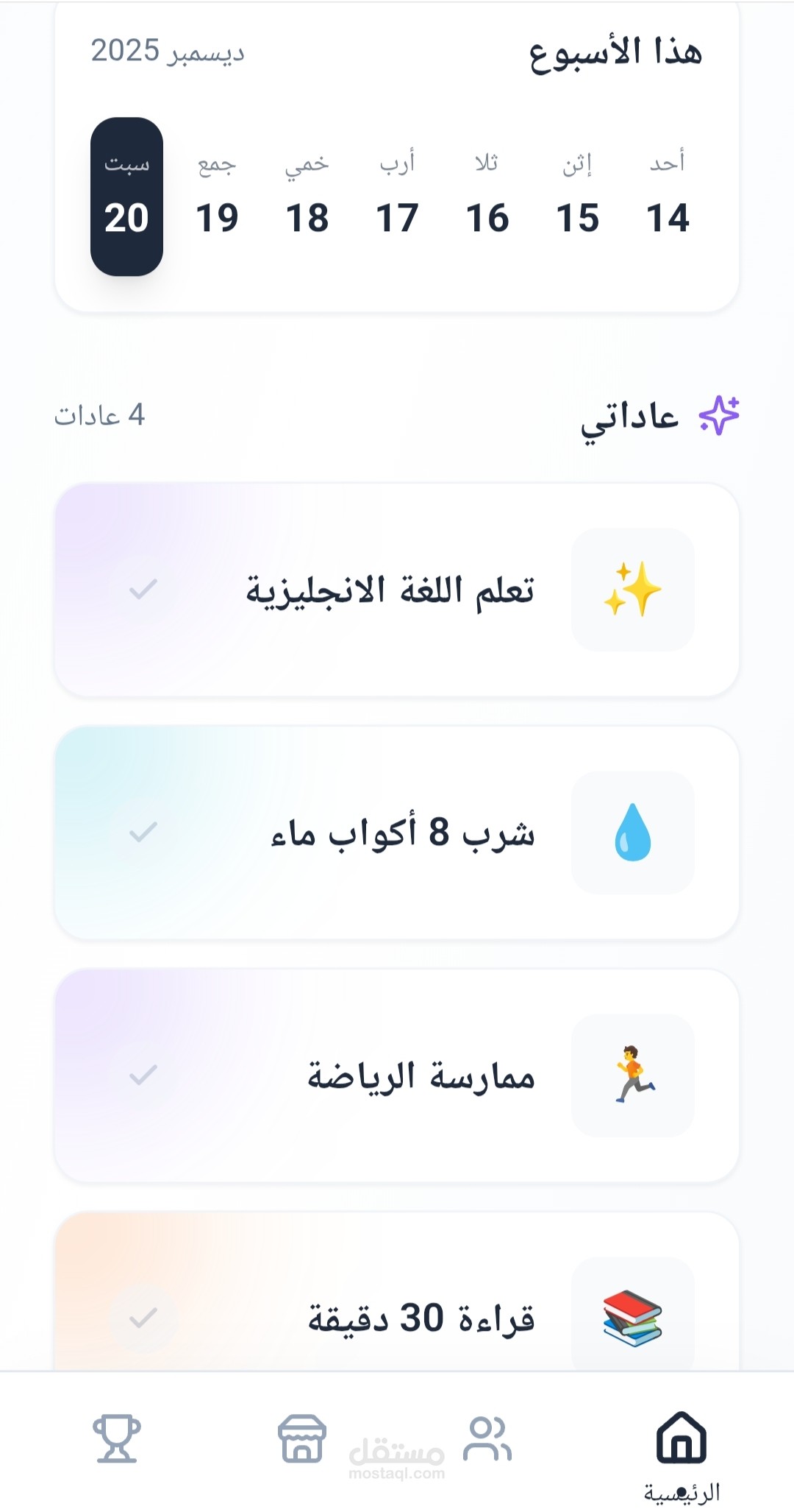 يوفّر التطبيق تجربة استخدام سلسة تتيح إضافة العادات، متابعة الإنجاز اليومي، ورؤية التقدم بشكل واضح يساعد على الاستمرار والانضباط.