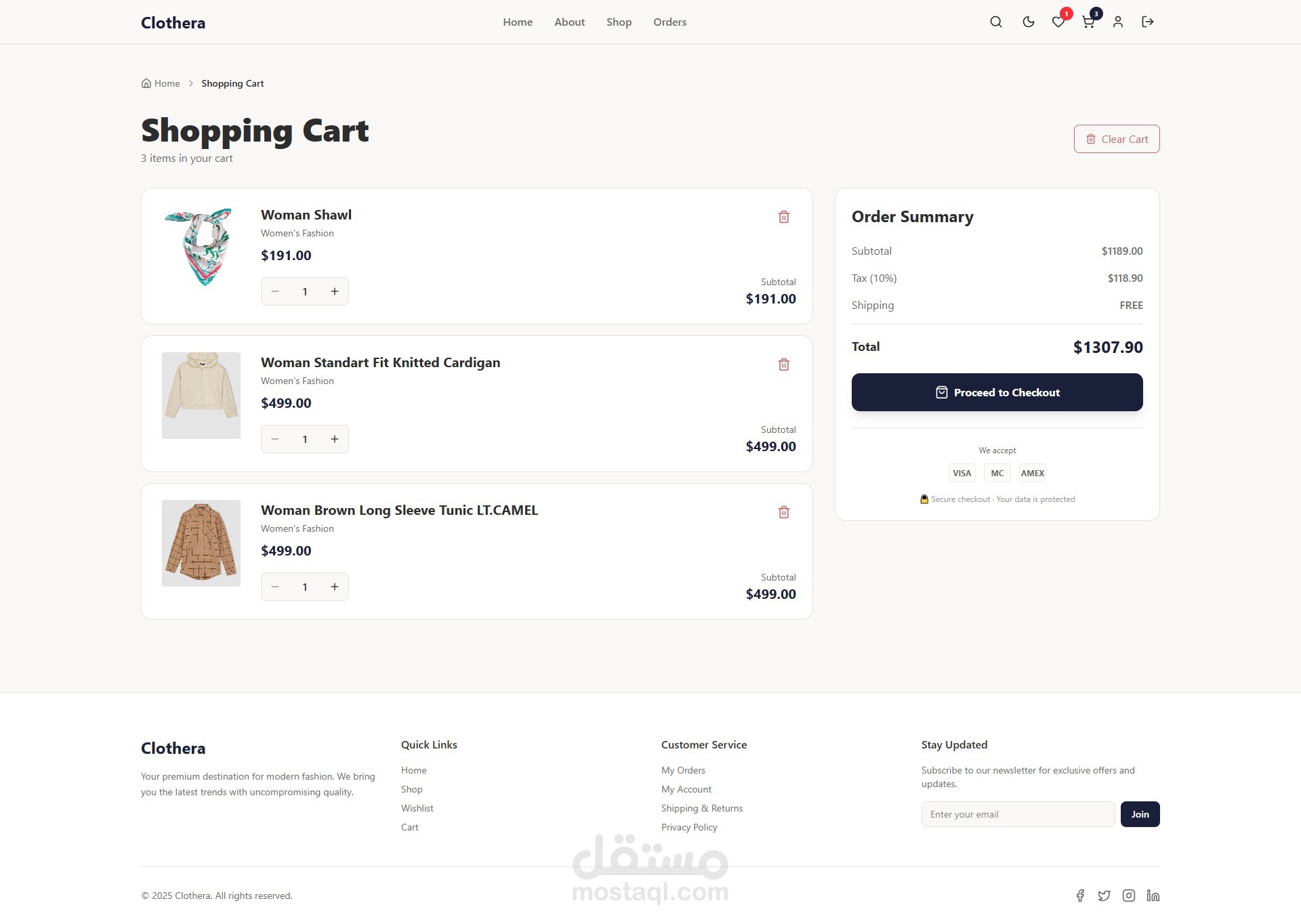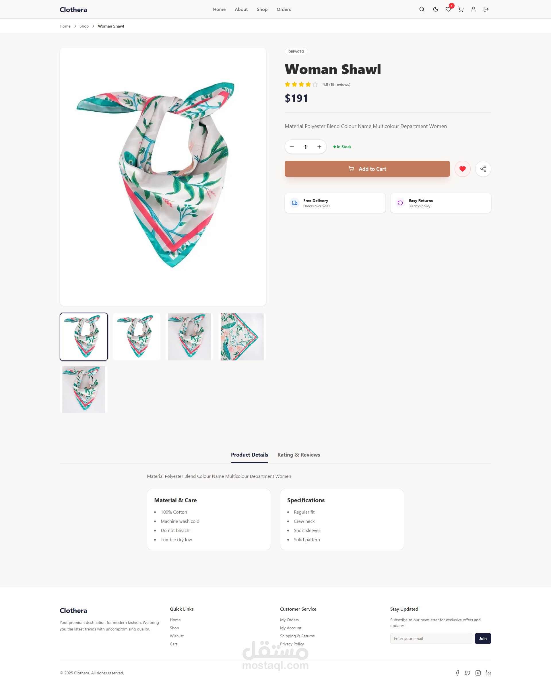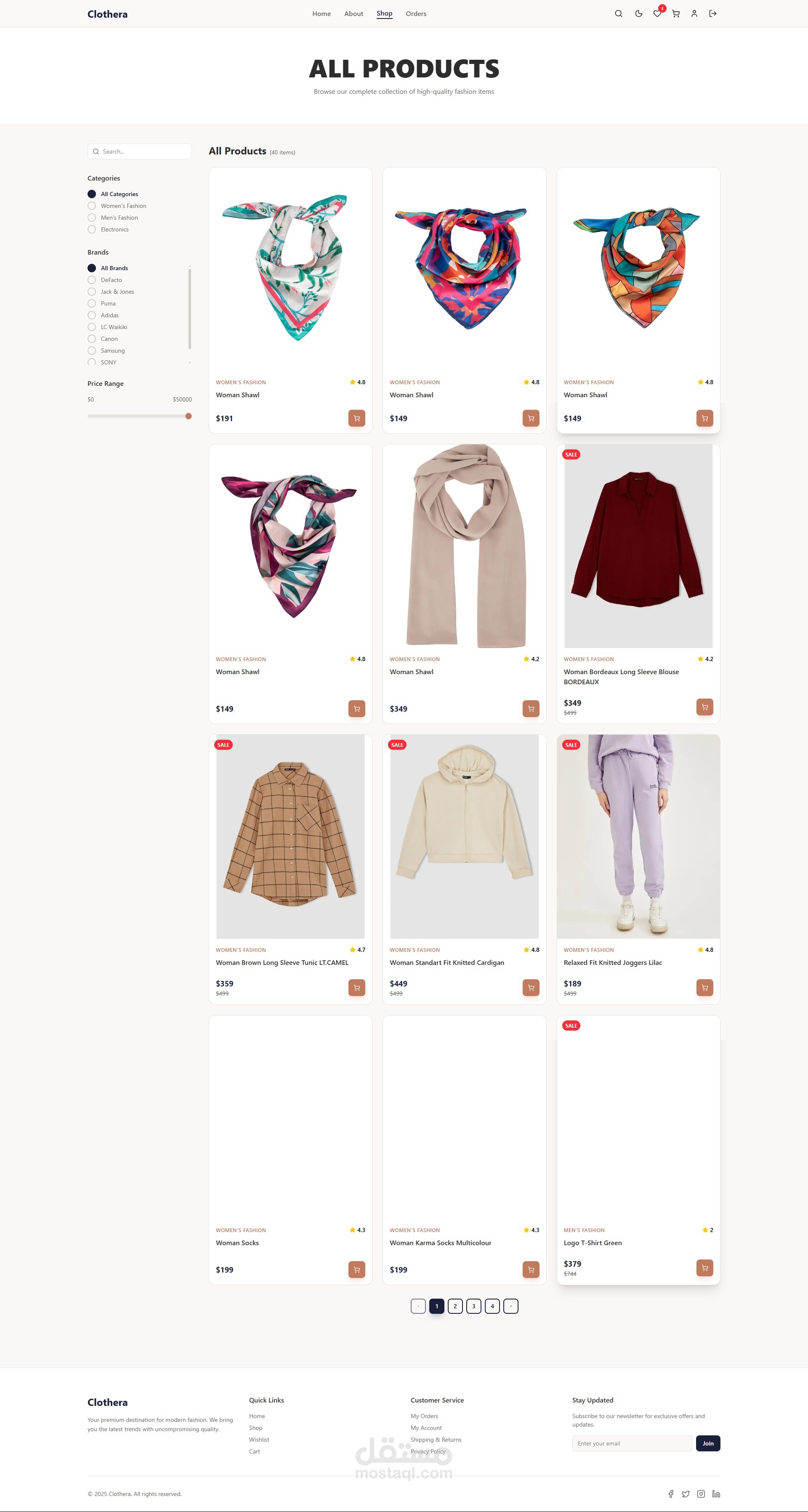 Clothera هو موقع متجر إلكتروني حديث لبيع الملابس والأزياء يُقدّم تجربة تسوق مميزة للمستخدمين عبر واجهة بسيطة ومنظمة.