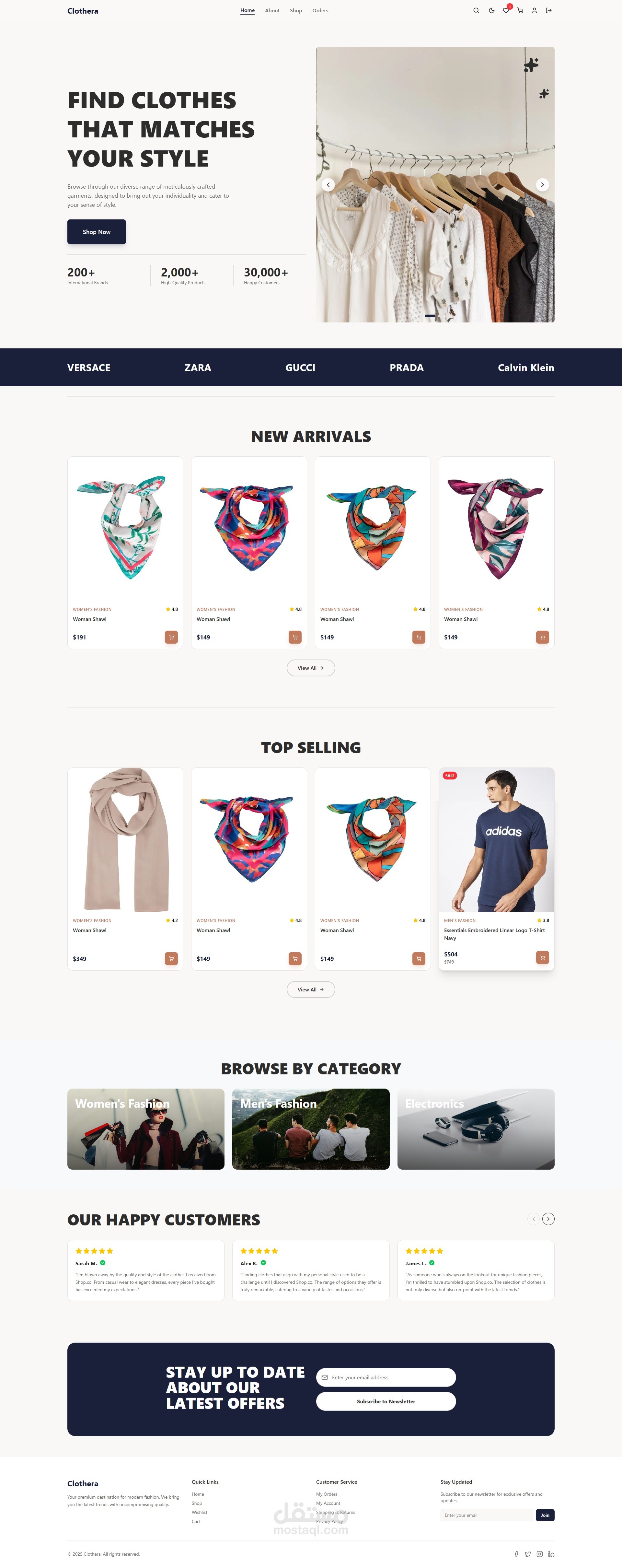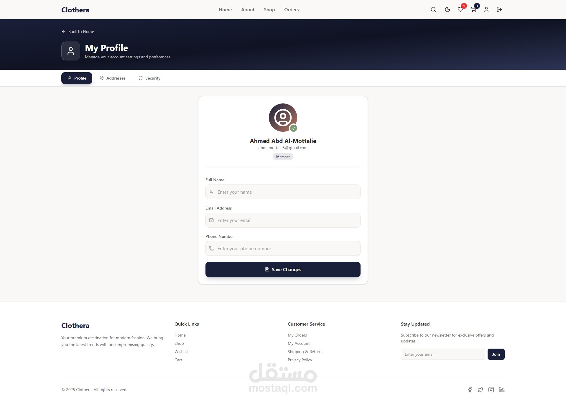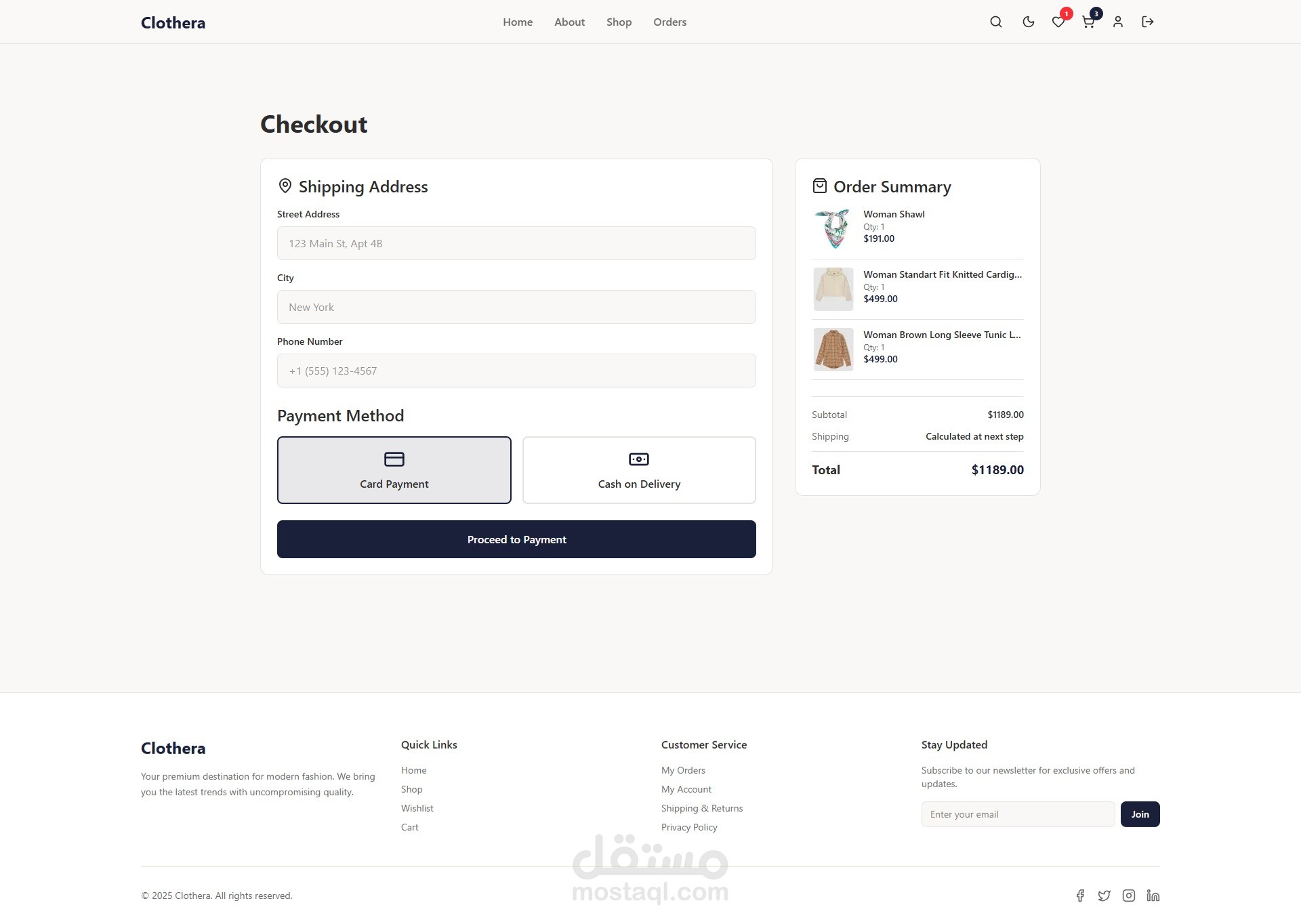 Clothera هو موقع متجر إلكتروني حديث لبيع الملابس والأزياء يُقدّم تجربة تسوق مميزة للمستخدمين عبر واجهة بسيطة ومنظمة.