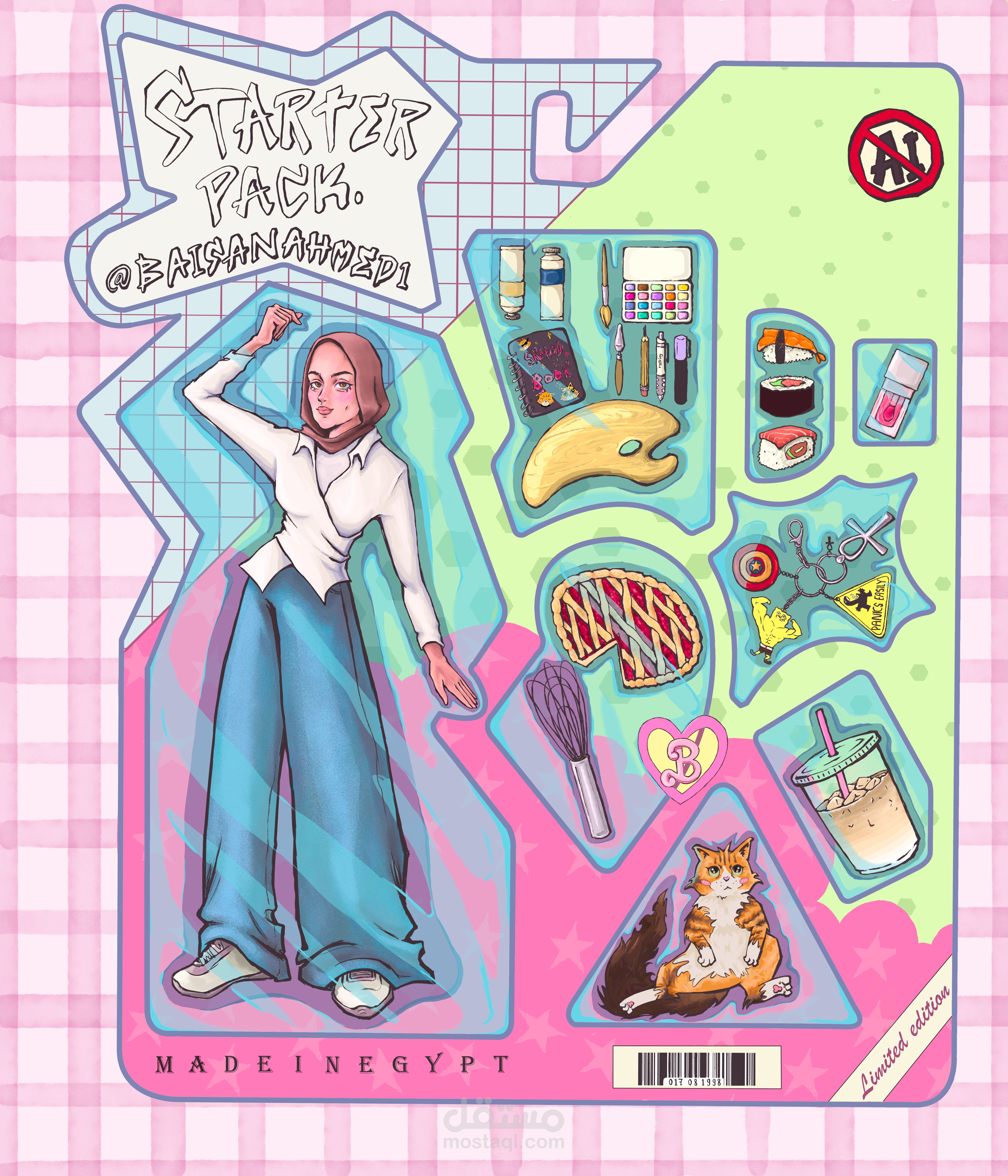 تصميم Artist Starter Pack يعرض هويتي الفنية كفنانة رقمية، ويوضح مجالات عملي، مهاراتي، والأدوات التي أستخدمها في الرسم الرقمي وتصميم الشخصيات