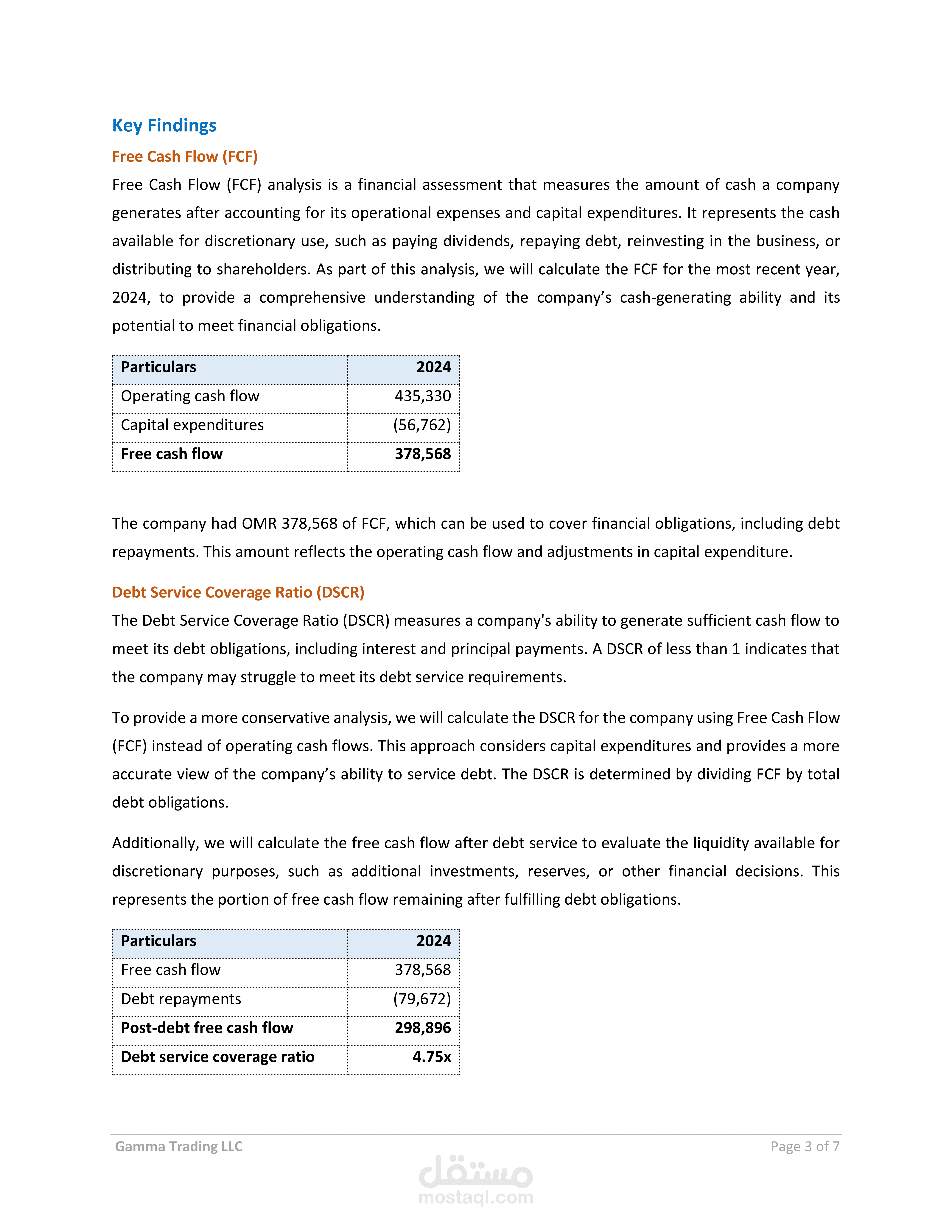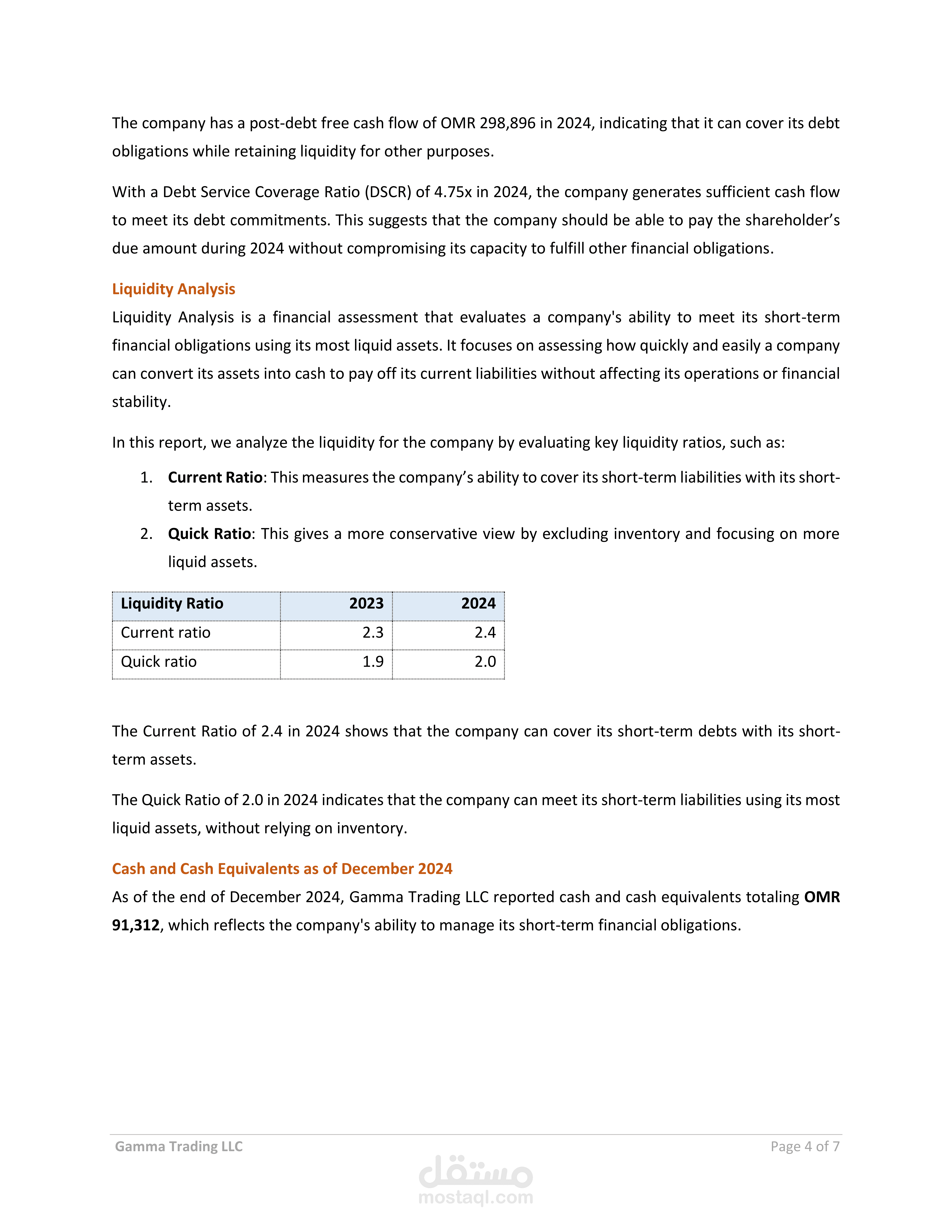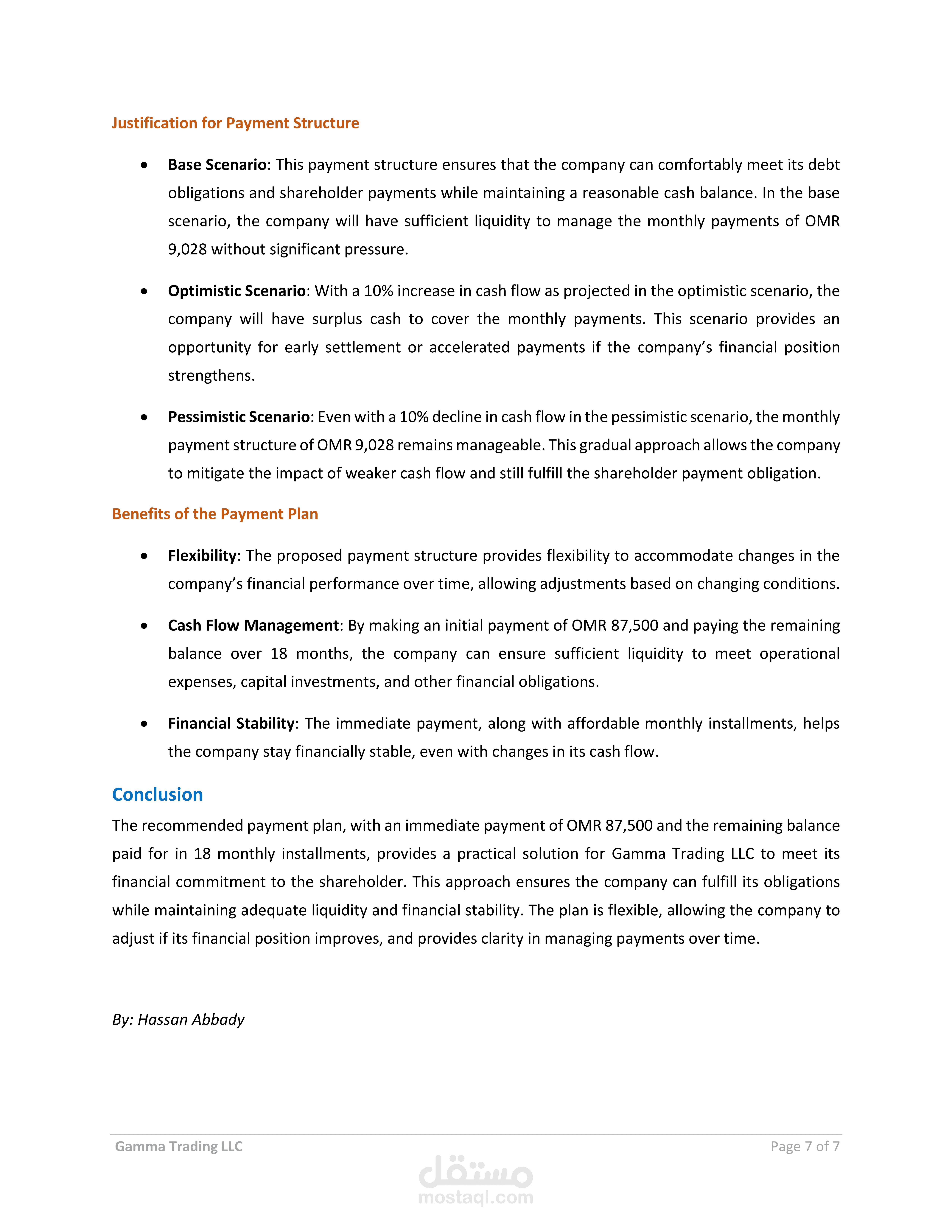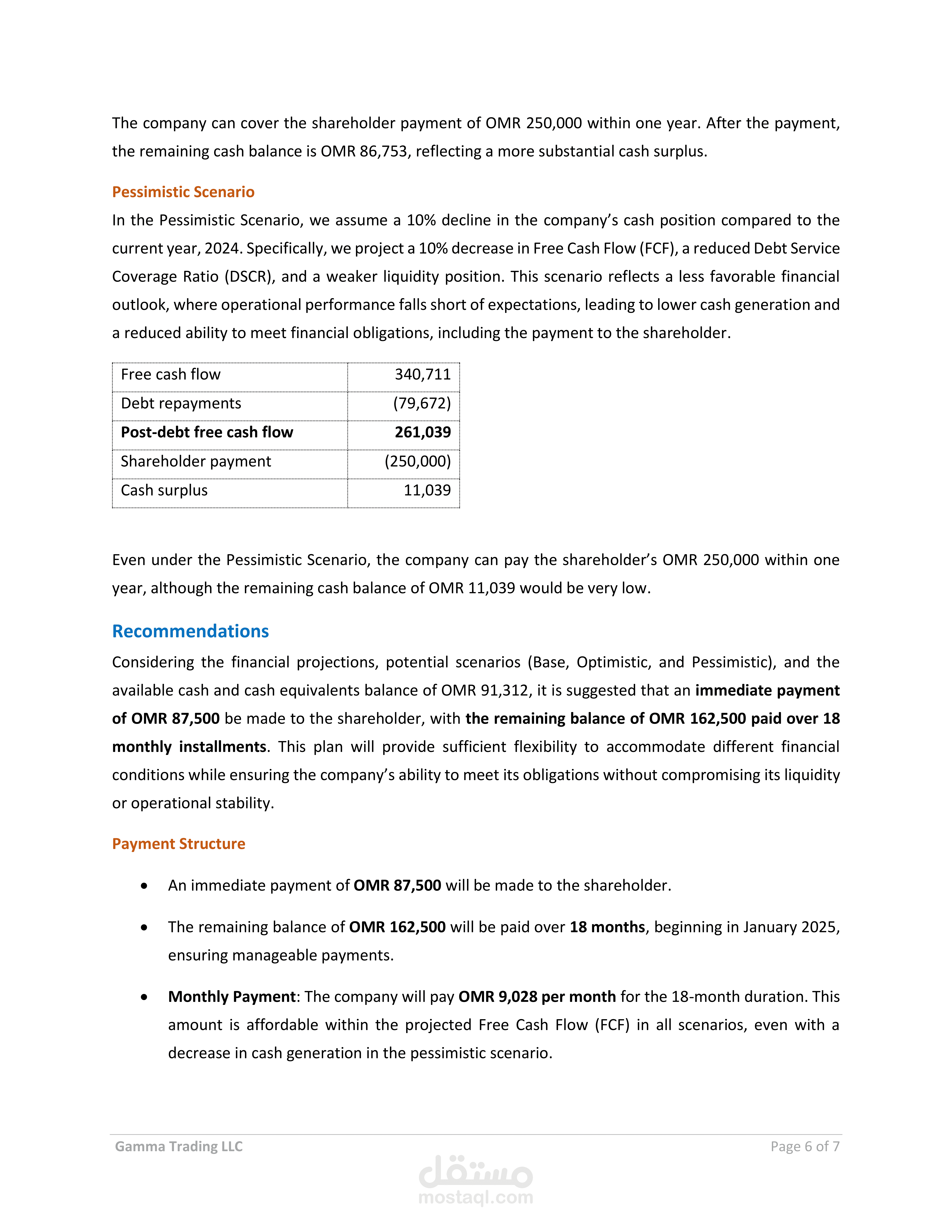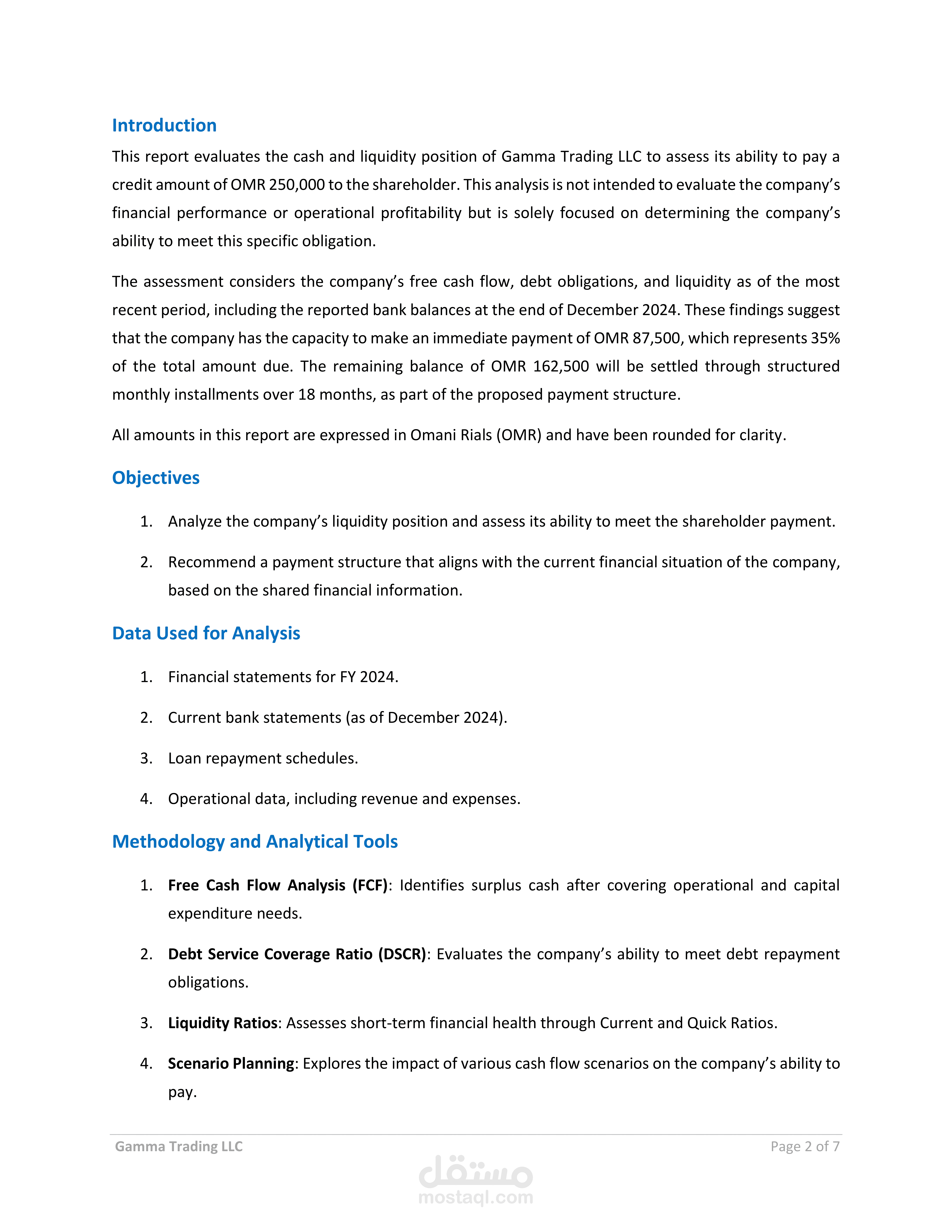 يمثل هذا المشروع استشارة مالية متكاملة تهدف إلى تقييم سيولة الشركة وتدفقاتها النقدية لتحديد قدرتها على الوفاء بالتزامات تجاه أحد المساهمين. يشمل التقرير تقديم توصيات عملية لهيكل دفع محدد ومرن، مع دمج تحليل التدفقات النقدية الحرة، ونسبة تغطية خدمة الدين، وتطبيق سيناريوهات متعددة لتقدير أثر القرارات المالية على السيولة والاستقرار المالي.