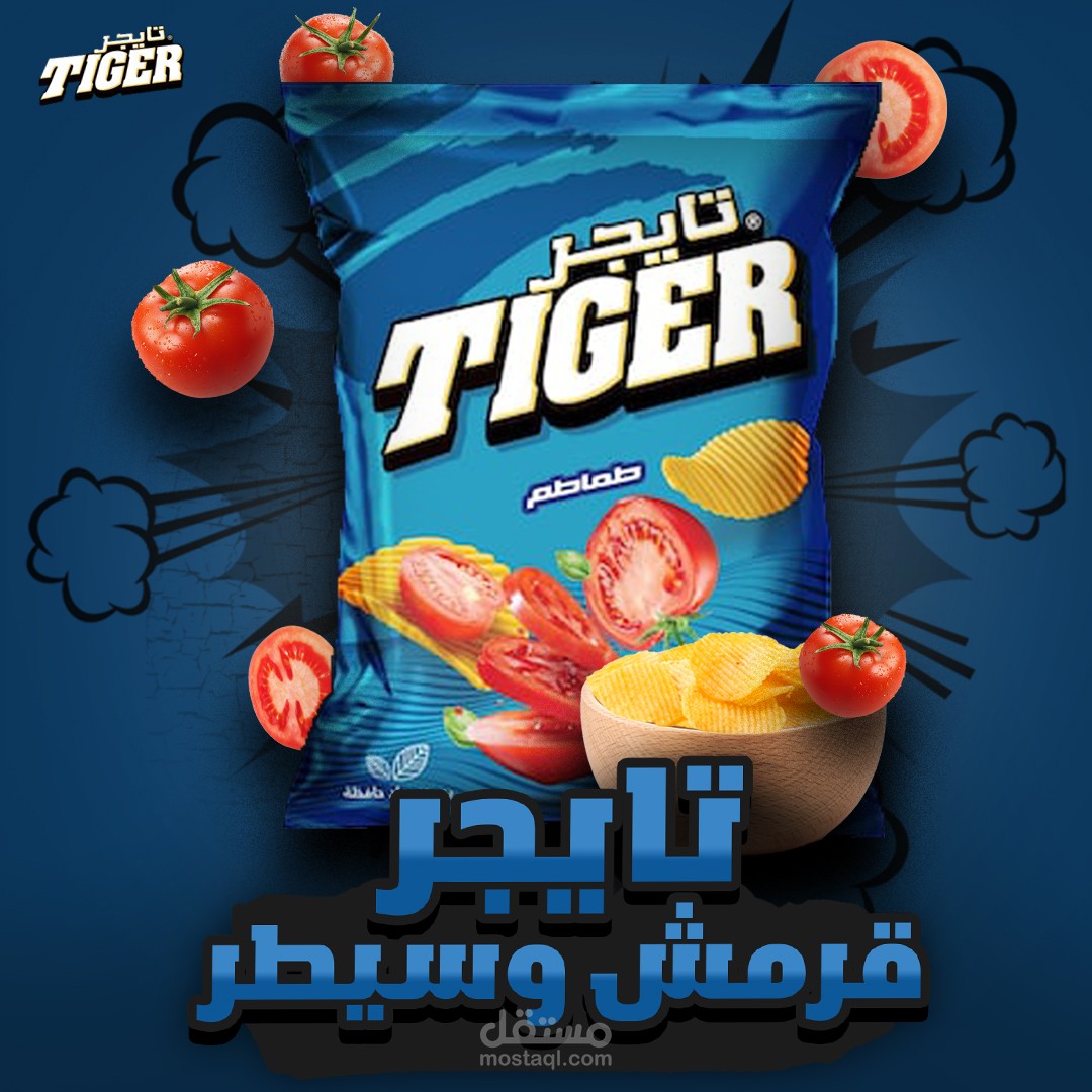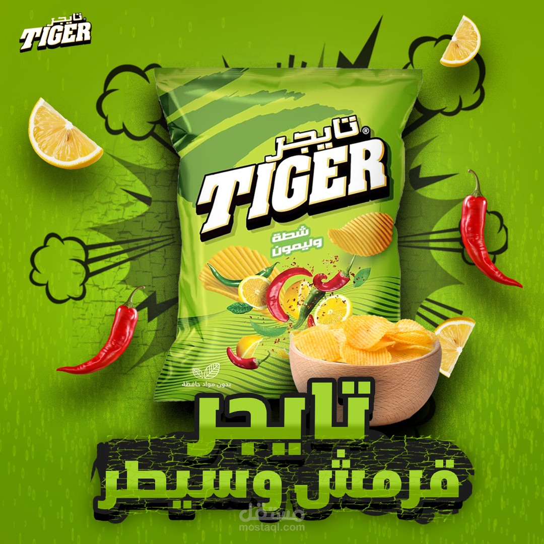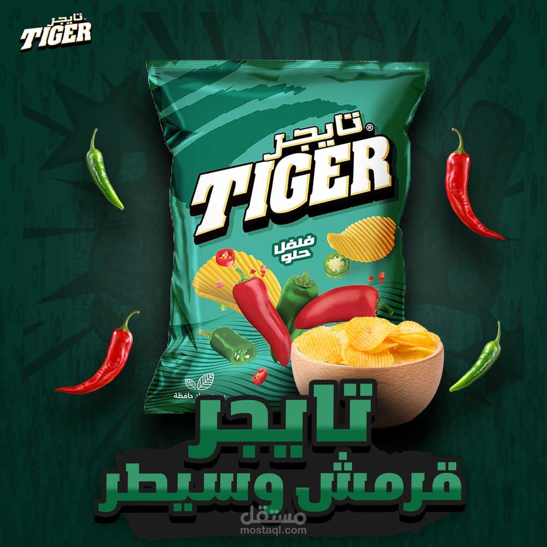 تصميم إعلان تجاري احترافي لمنتج شيبسي بنكهة حارة، يعتمد على ألوان داكنة وقوية تعكس طعم المنتج الجريء.