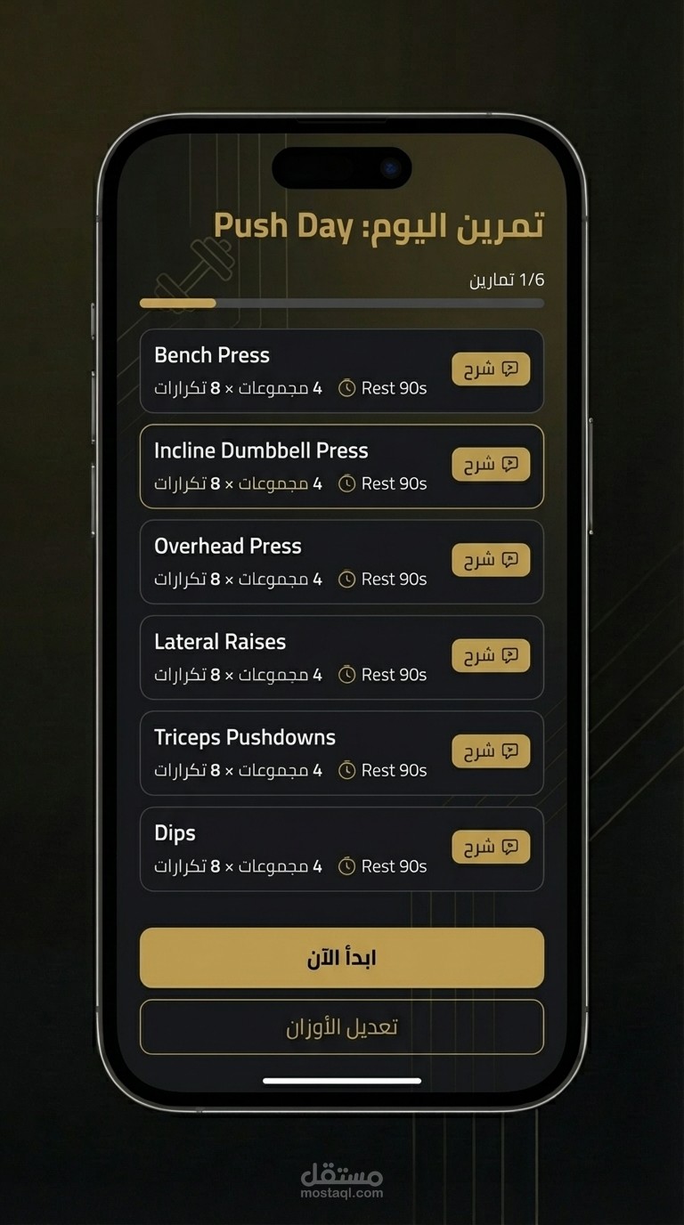 Workout Details: قائمة التمارين + Sets/Reps/Rest + تسجيل أوزان