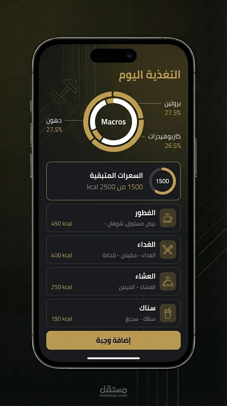 Nutrition: تتبع السعرات والماكروز + إدارة الوجبات
