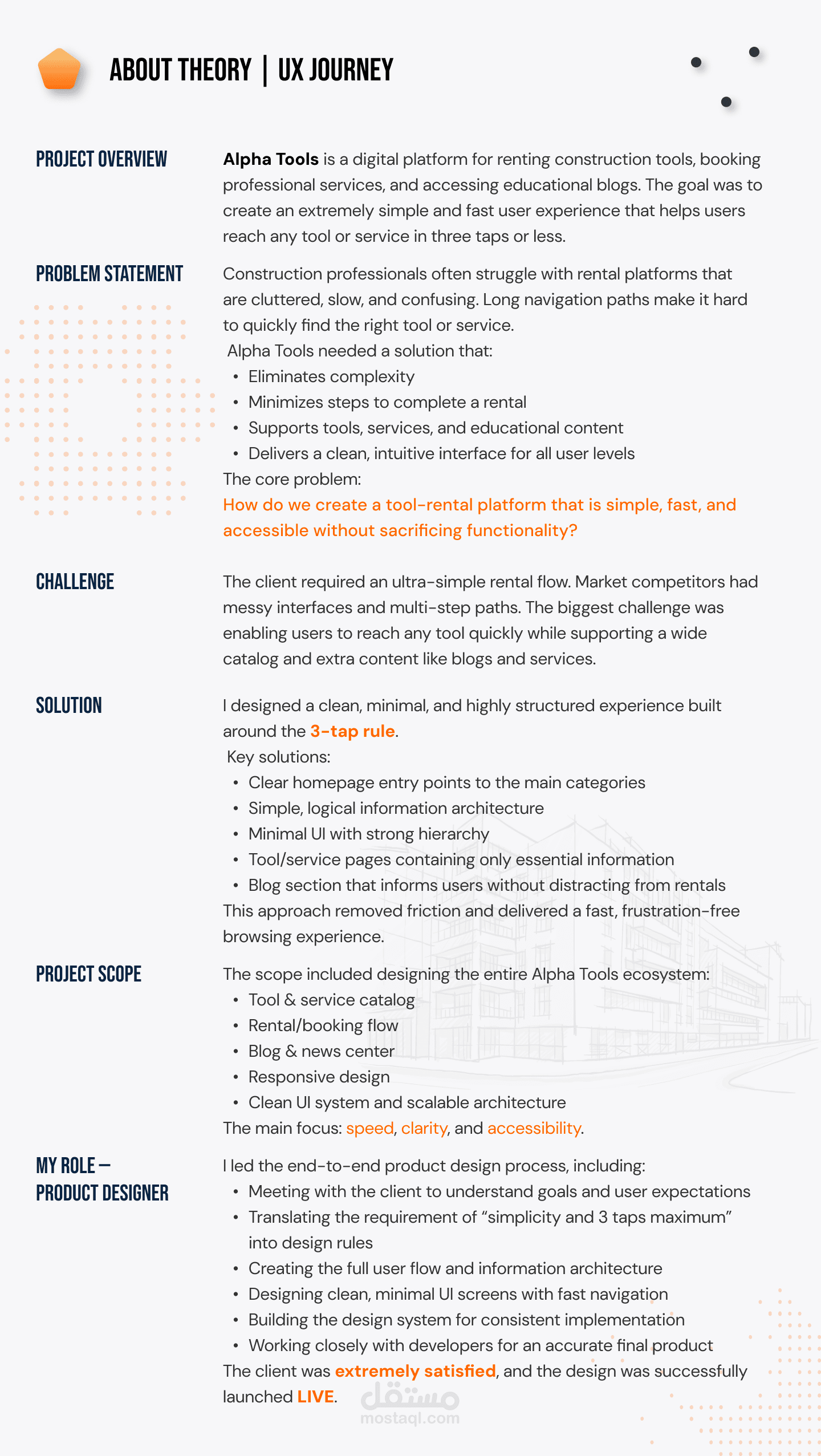 تم تصميم منصة Alpha Tools كحل رقمي متكامل لتأجير أدوات البناء، حجز الخدمات الاحترافية، وتصفح المحتوى التعليمي، مع التركيز على تجربة مستخدم بسيطة وسريعة. الهدف الأساسي كان تمكين المستخدم من الوصول إلى أي أداة أو خدمة خلال ثلاث نقرات كحد أقصى، دون التضحية بالوظائف أو المحتوى. تم بناء التجربة اعتمادًا على هيكل معلومات واضح، واجهة نظيفة، وتسلسل بصري قوي يقلل التعقيد ويُسهل اتخاذ القرار، مع دعم كامل لمختلف مستويات المستخدمين. النتيجة كانت تجربة استخدام سلسة، واضحة، وخالية من التعقيد، عززت سرعة التصفح ورفعت مستوى رضا المستخدم والعميل على حد سواء.